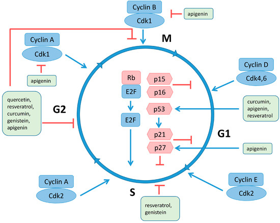 The effect of polyphenols on cell cycle. Cell cycle phases with (i) stimulatory proteins: cyclin-Cdk complexes and eukaryote transcription factor (E2F) in blue and (ii) inhibitory proteins: retinoblastoma protein (Rb), p15, p16, p21, p27 and p53 in red; phosphorylation of Rb will release E2F which further stimulates cell cycle progression; p53, the tumor suppressor protein is responsible for stimulation of p21 and p27 expression, two inhibitory proteins of the cyclin-Cdk complexes [103,104,105,106,107,108]. Quercetin, resveratrol, curcumin, genisteins and apigenin arrest the cells in G2/M phase, while resveratrol and genistein in S phase; apigenin inhibits Cyclin A, B-Cdk1 complexes, and stimulate p21 and p27; curcumin, apigenin and resveratrol increase the activity of p53 [100,101,102,109,110,111,112,113]. Blue and red lines indicate stimulation and inhibition, respectively, of the process (for the sake of simplicity only the major proteins involved in cell cycle regulation are shown).