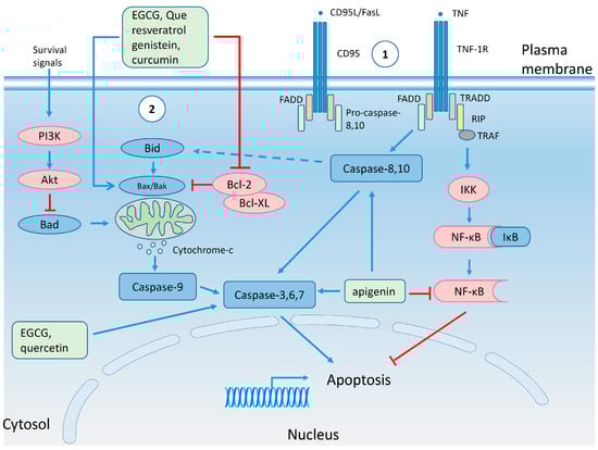 The effect of polyphenols on apoptotic signaling pathways. Extrinsic (1) and intrinsic (2) apoptosis pathways are shown in the figure. The proteins with pro-apoptotic activity (caspases, Bax, Bak, Bid, Bad, IkB) are colored in blue, while the proteins with anti-apoptotic action (Bcl-2, Bcl-XL, PI3K, Akt, IKK, NF-kB) in red. EGCG, resveratrol, genistein and curcumin can inhibit anti-apoptotic proteins (Bcl-2) and stimulate the pro-apoptotic ones (Bax, Bak); caspases are stimulated by EGCG, quercetin and apigenin; the anti-apoptotic activity of NF-kB can be inhibited by apigenin [115,116,117,118,119,120,121]. Blue and red lines indicate stimulation and inhibition, respectively, of the process (for the sake of simplicity only the major proteins of the apoptosis pathways are shown).