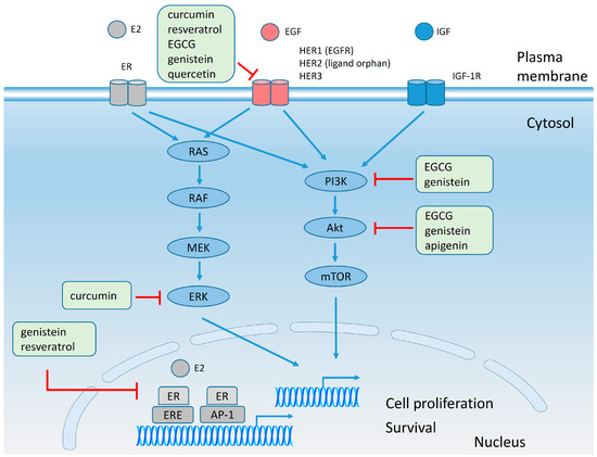 The effect of polyphenols on nuclear ER, HER2 and IGF signaling pathways. Two main mechanisms of E2 action are depicted: (i) genomic activity of nuclear ER in connection with ERE or activating protein-1 (AP-1) transcription factors and (ii) cell surface activity of plasma membrane ER in connection with growth factor receptor signaling pathways [21,139]. Nuclear ER activity might be inhibited by genistein and resveratrol; the expression or phosphorylation of EGFR family can be downregulated by curcumin, resveratrol, quercetin and genistein; ERK phosphorylation can be reduced by curcumin; PI3K activity can be inhibited by EGCG and genistein, while Akt action can be inhibited by EGCG, genistein and apigenin [142,143,144,145,146,147,148,149]. Blue and red lines indicate stimulation and inhibition, respectively (for the sake of simplicity only the major proteins of the signaling pathways were included).