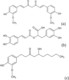 | Other polyphenols | ![]() | Curcumin (a) Rosmarinic acid (b) Gingerol (c) | Turmeric (Curcuma longa) Rosemary (Rosmarinus officinalis) Ginger (Zingiber officinale) |