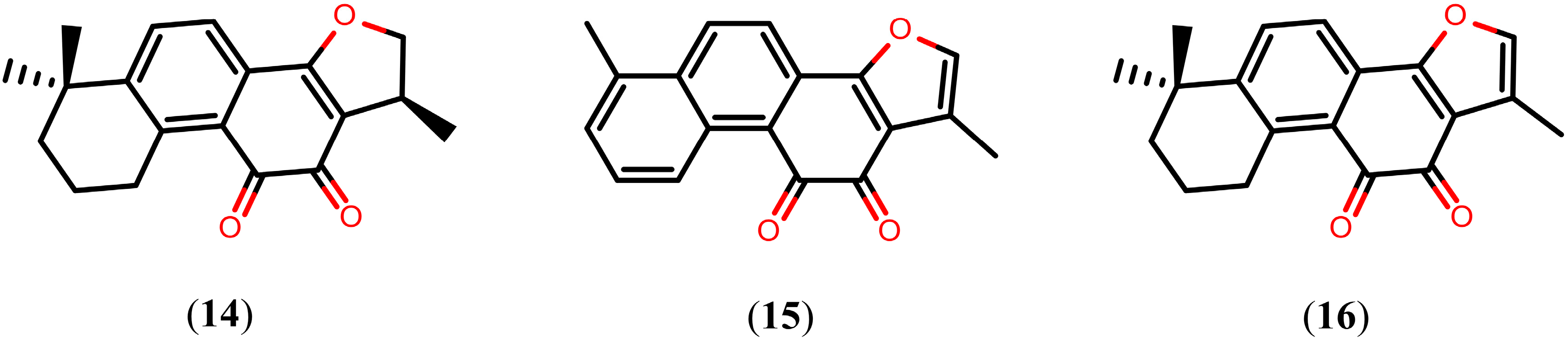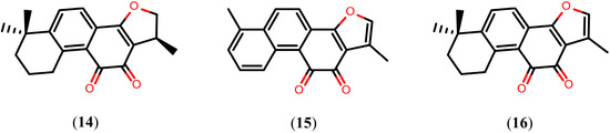 The above documented compounds were mainly evaluated based on the number of dead worms and alterations in the tegument after treatment. However, few studies have reported on their mechanism of action. Now that the complete genome sequences of S. mansoni [75] and S. japonicum [76] have been elucidated, genomic and proteomic approaches can be used to identify potential targets for drug design. In recent years, several interesting drug targets have been proposed, including enzymes that play an important role in the biochemical pathways of schistosomes [77,78,79,80,81]. Tanshinones, a group of abietane diterpenes isolated form Salvia miltiorrhiza and originally considered for the prevention and treatment of cardiovascular and cerebrovascular diseases [82,83], have been shown to inhibit S. mansoni thioredoxin glutathione reductase (SmTGR). These compounds, more specifically cryptotanshinone (14), tanshinone I (15), and tanshinone IIA (16), inhibit the SmTGR enzyme with IC50 values of 3.9 µM, 8.9 µM, and 10.9 µM, respectively [84]. Structures of the tanshinones (compounds 14–16) are shown in Figure 3. Schistosomes possess a streamlined thiol-based redox system in which a single enzyme, SmTGR, a fusion of a glutaredoxin domain to canonical thioredoxin reductase domains, supplies electrons to oxidized glutathione and thioredoxin. Therefore, after inhibition of SmTGR, schistosomes die of oxidative damage from the host, such as lipid peroxidation, and protein and DNA oxidation, thereby suggesting that tanshinones can be promising leads for drug design [85,86,87].