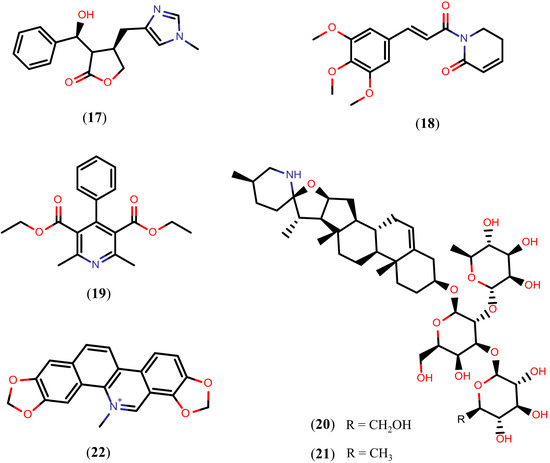 Alkaloids are a group of NPs that contain basic nitrogen atoms. They are widely found in plants, bacteria, fungi, and animals. Several alkaloids have schistosomicidal activity, many of which display promising biological activities (Figure 4). The imidazole alkaloid epiisopiloturine (17), isolated from the leaves of Pilocarpus microphyllus, caused extensive disruption of tegument, such as sloughing, total reduction of motor activity, and the death of all S. mansoni adult worms 120 h post-exposure in vitro (at 523 µM). Using the sub-lethal concentration of 350 µM, compound 17 caused a 100% reduction in egg production. In addition, compound 17 showed selective schistosomicidal activity and exhibited lower cytotoxicity to Vero mammalian cells (1.7 mM had no noticeable effect on cell viability) [88].