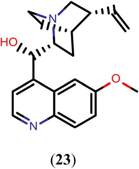 Quinoline methanols are alkaloids with a methanol group at the 4-position of the quinoline scaffold. Since 1811, when the first of these quinolines was isolated from Cinchona officinalis, many other quinoline methanols have been isolated and widely used for the treatment of malaria. Remarkably, quinoline methanols, such as quinidine (23, Figure 5), have also been shown to exhibit promising in vivo activity against S. mansoni worms. Drug 23, at a dose of 75 mg/kg/day, caused 61% decrease in worm burden and 54%, 72%, and 98% decrease of egg production in the liver, small intestine, and large intestine, respectively [94].