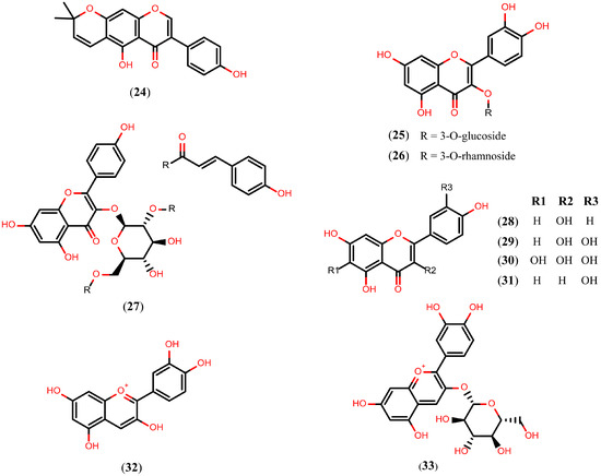 The alpinum isoflavone (24), an isoflavone isolated from Millettia thonningii, exhibited cercaricidal activity in vitro, killing all cercariae at a concentration of 150 μM after 30 minutes of exposure. Moreover, compound 24, at a concentration of 75 µM, also killed 90% of the adult S. mansoni worms after 72 h of exposure and caused 100% of the decrease in egg production [107]. Isoquercetin (quercetin 3-O-glucoside) (25), a flavonol isolated from the aerial parts of Roupala montana, caused 75% of the decrease in motor activity of adult S. mansoni worms incubated in vitro under a concentration of 100 µM. Quercitrin (26), a similar flavonol isolated from the aerial parts of Roupala montana and Schefflera vinosa, also caused 75% of the decrease in motor activity at a 50 µM concentration [108].