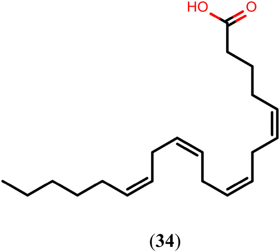 Arachidonic acid (34, Figure 7) is a long-chain essential polyunsaturated fatty acid belonging to the omega-6 group. It plays an important role in metabolic processes as a precursor of prostaglandins, leukotrienes, and thromboxanes. Due to a growing interest in the application of compound 34 in various fields of dietary and health requirements, much attention has been given to the industrial production of 34-containing oil through the cultivation of Mortierella alpina [111,112,113]. Recently it has been shown that compound 34 killed all juvenile and adult schistosomes in vitro at a concentration of 10 mM and displayed significantly high worm burden reduction (63%–81%) in mice and hamsters infected with S. mansoni and S. haematobium, respectively, at a dose of 1000 mg/kg. In addition, in vitro exposure to 5 mM of compound 34 caused extensive damage, disorganization, and degeneration of the tegument and of the subtegumental musculature [114].