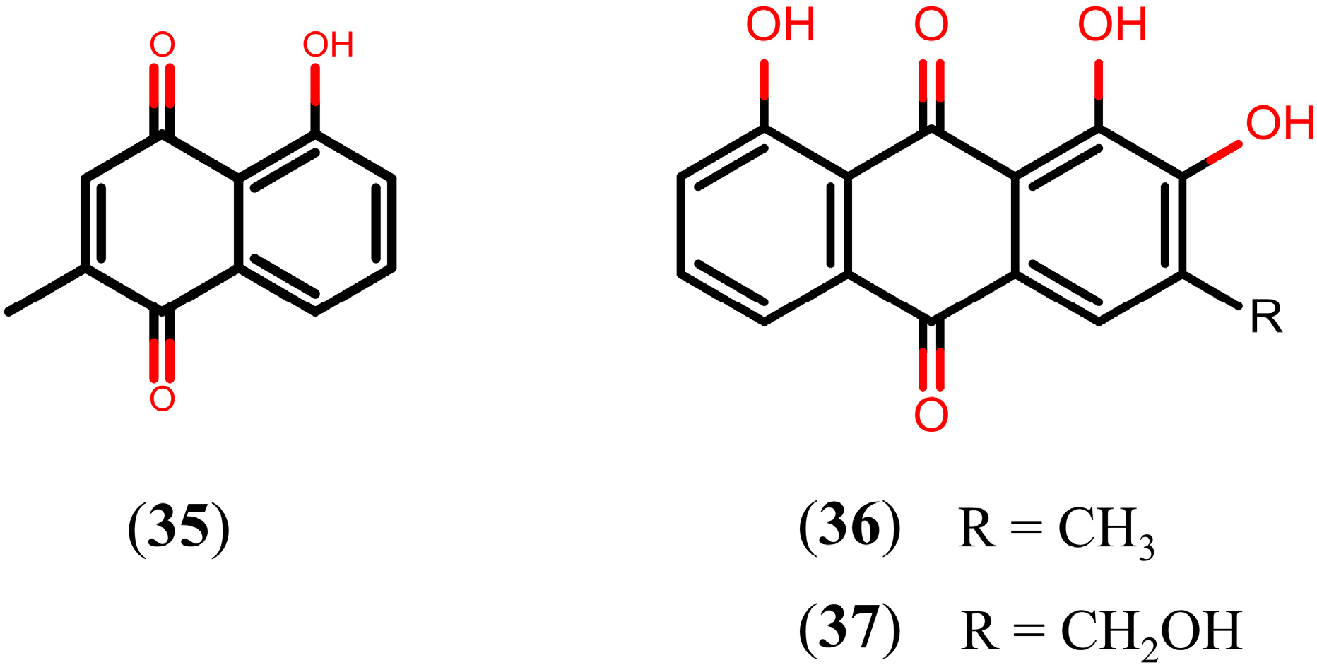 Quinones are a class of natural oxidized derivatives of aromatic compounds with the quinone structure and they can be mainly classified into three types—benzoquinone, naphthoquinone, and anthraquinone—according to the number of benzene rings in the structural skeleton and the presence of fused rings [118]. So far, three quinones have been reported as leading candidates in schistosome discovery (Figure 8). The in vitro study with plumbagin (35), a naphthoquinone isolated from the aerial parts of Plumbago scandens [119], resulted in 100% mortality of adult S. mansoni worms at 48 h post-exposure and caused severe erosion and disintegration of the tegumental surface between tubercles, at a concentration of 10 µM. In the same study, it was also found that the exposure of adult S. mansoni worms, at a 10 µM concentration of compound 35 for 24 h, resulted in prominent alterations of the tegumental surfaces, usually with disintegration of tubercles and often accompanied by a decrease in the number of spines. In addition, compound 35 also exhibited strong cercaricidal activity in vitro, killing all cercariae, at a concentration of 0.5 μM, after an exposure time of three hours [93].