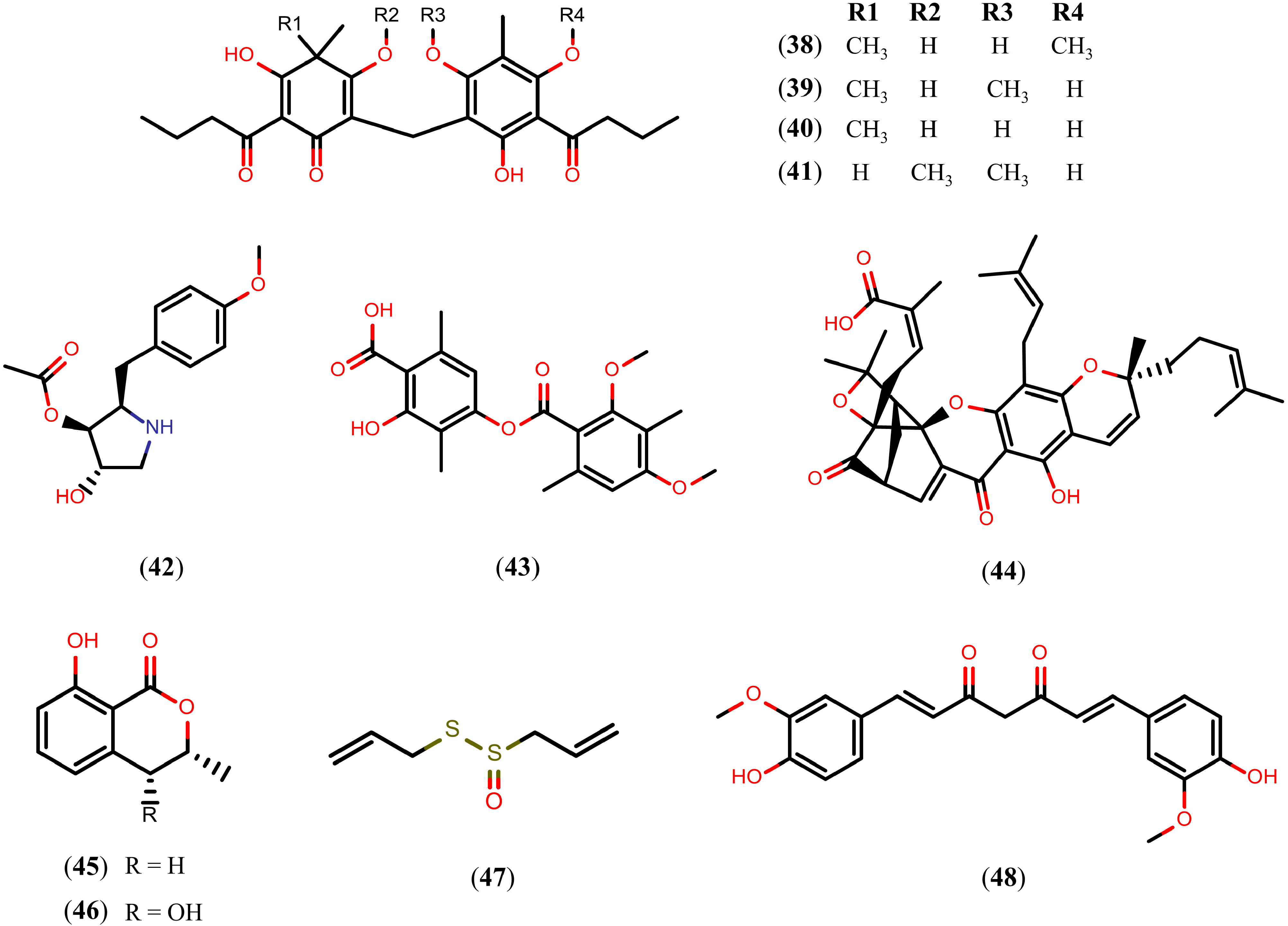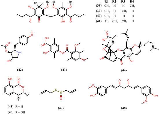 A variety of NPs belonging to the alkaloid, terpenoid, and flavonoid families present schistosomicidal activity. However, schistosomicidal activity of the NPs is not just limited to these classes. Figure 9 presents NPs belonging to other chemical classes or other natural sources with schistosomicidal activity. First, we refer to phloroglucinol derivatives, a distinct class of NPs obtained from the rhizomes of Dryopteris species that showed satisfactory activity against S. mansoni adult worms. In vitro studies showed that after 24 h of exposure to aspidin (38) and desaspidin (39) (25 μM), and flavaspidic acid (40) and methylene-bis-aspidinol (41) (50 μM and 100 μM, respectively), all of the adult worms were eliminated. All of the paired adult worms were also separated into individual male worms and female worms after 24 h of exposure to compound 41 (10 μM), and compound 40 (50 μM). In addition, all of the worms exposed to compounds 38 and 39 showed decrease motor activity at 10 μM concentration, while exposure to compounds 40 and 41 caused decrease motor activity at 25 μM and 100 μM concentrations, respectively [121].