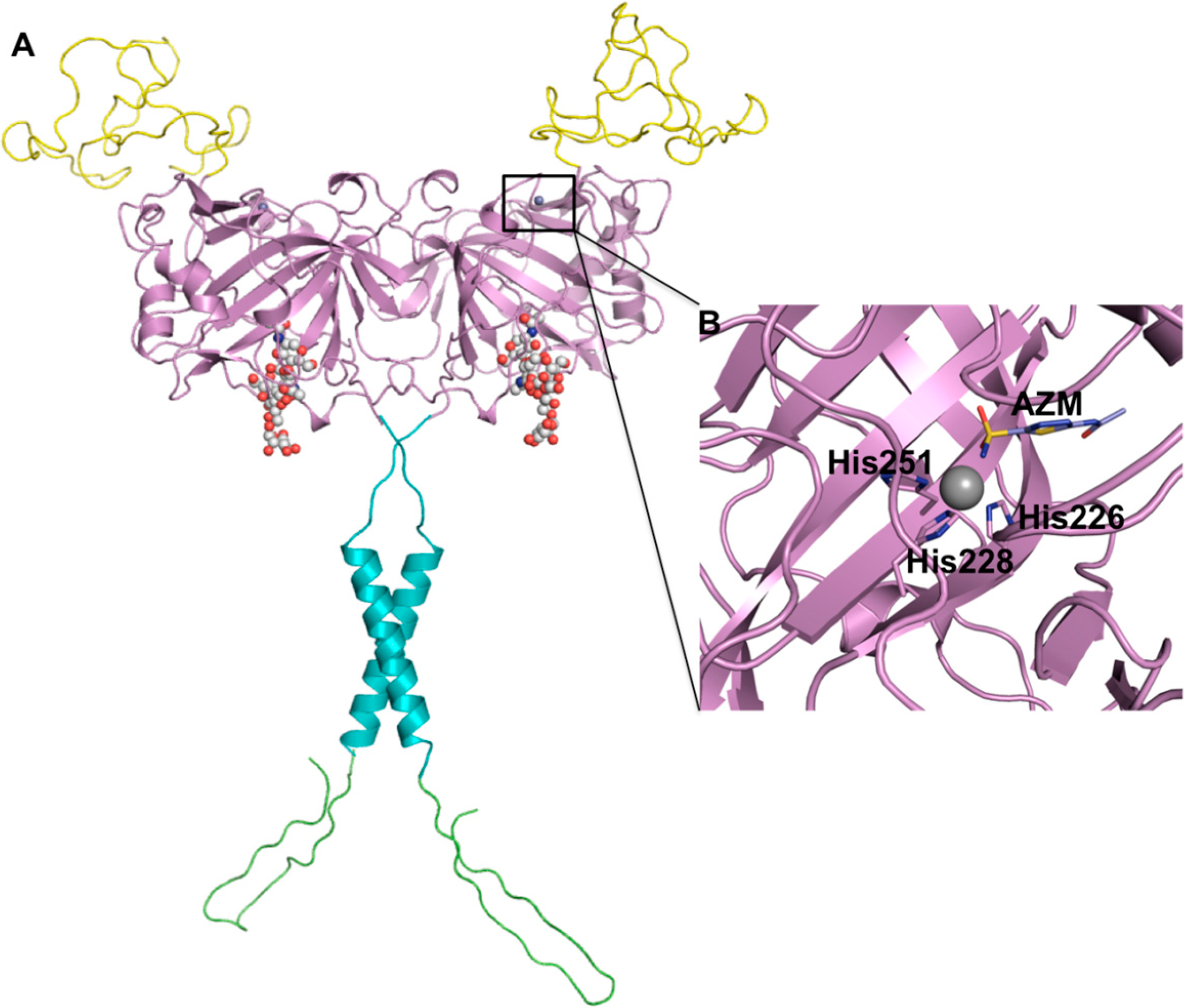 (A) Schematic diagram of CA IX structure. Proteoglycan-like domain (PG, yellow), catalytic domain (CA, violet), a transmembrane anchor (TM, cyan), and an intracellular domain (IC, green). Spheres represent glycosylation sites. The PG domain was generated using a structure prediction server Robetta [24] and the CA domain is from the coordinates of the CA IX crystal structure (PDB ID: 3IAI). The TM anchor and IC domain were generated using Chimera [25] and COOT [26] software packages, respectively. This figure was adapted from: Mahon et al. [27] (B) Acetazolamide (AZM) bound in the active site of CA IX (PDB ID: 3IAI). Figure was created using PyMol [28].