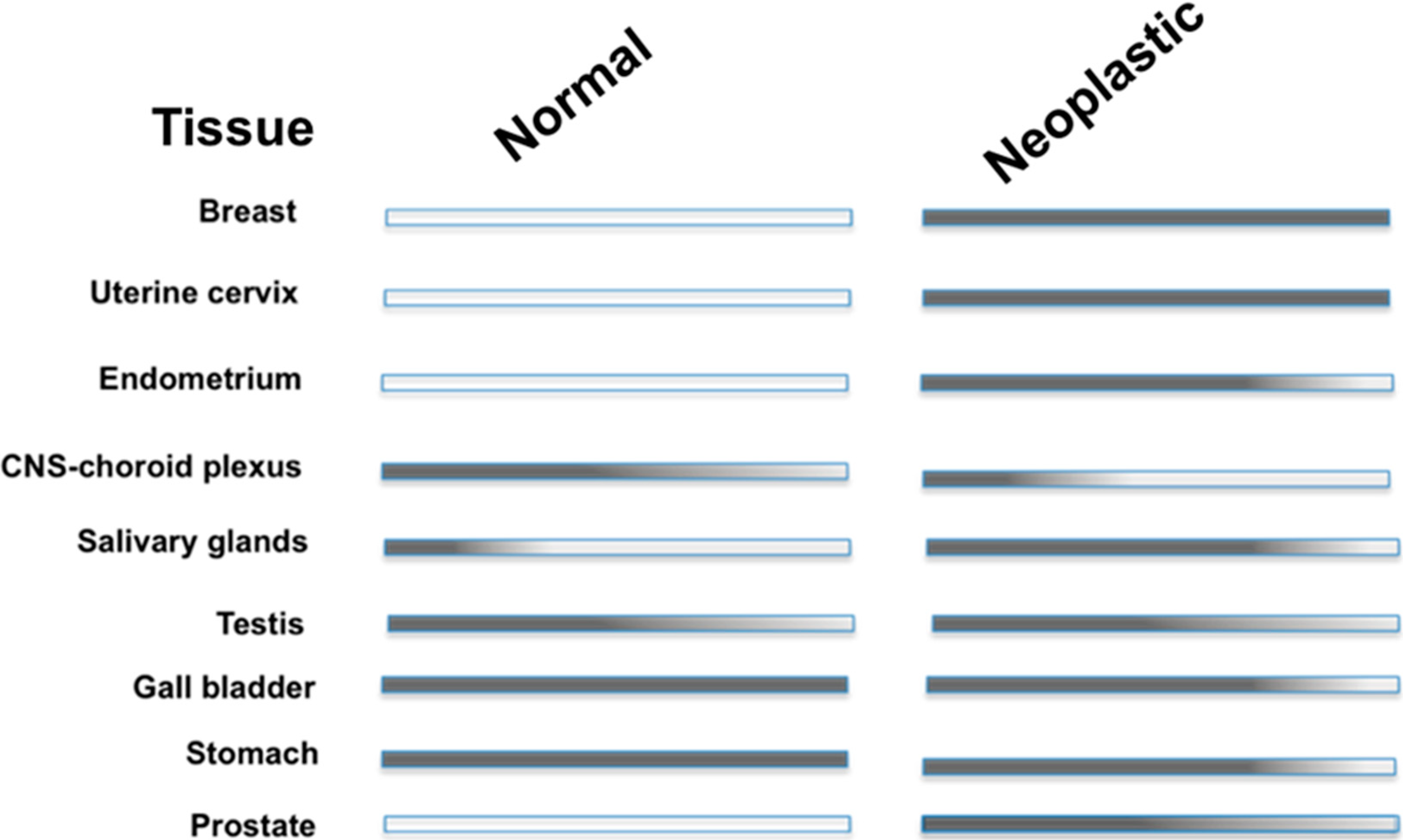 CA IX is ectopically expressed in a variety of neoplastic tissues. Expression has been observed in malignancies of the breast, lung, kidney, colon/rectum, cervix uteri, oral cavity (head/neck), gallbladder, liver, brain (high-grade), pancreas, and gastric epithelium [31,43,44]. A list of the differential expression patterns of CA IX in normal and neoplastic tissue is presented in Figure 2. No differences exist between the cDNA of CA IX isolated from normal and tumor tissues, which implies similar physiological function in both tissues. As mentioned previously, CA IX expression depends on HIF-1 activation (via the upregulation of HIF-1α or the down regulation of VHL). Specifically, the activation of the HIF-1 mediated pathway that induces CA IX expression can be due to a reduction in cellular O2 levels, an activation of signaling pathways via the presents of growth factors and inflammatory response elements, and in some cases due to mutations in the tumor suppressor, VHL as seen in cases of renal cell carcinoma (RCC) where CA IX is homogenously expressed [27]. More recently, CA IX has shown to have significant expression levels in stromal cells that are engaged in a molecular cross-talk circuitry with cancer cells. Specifically, CA IX has been shown to be expressed in cancer-associated fibroblasts (CAFs) via redox-based stabilization of HIF-1. It is postulated that expression of CA IX in CAFs provides the acidic extracellular environment necessary to drive epithelial-mesenchymal transitions (EMTs) in adjacent cancer cells [45]. Summation of these findings indicates CA IX as a diagnostic marker of events of tumor hypoxia in many solid tumors [43].