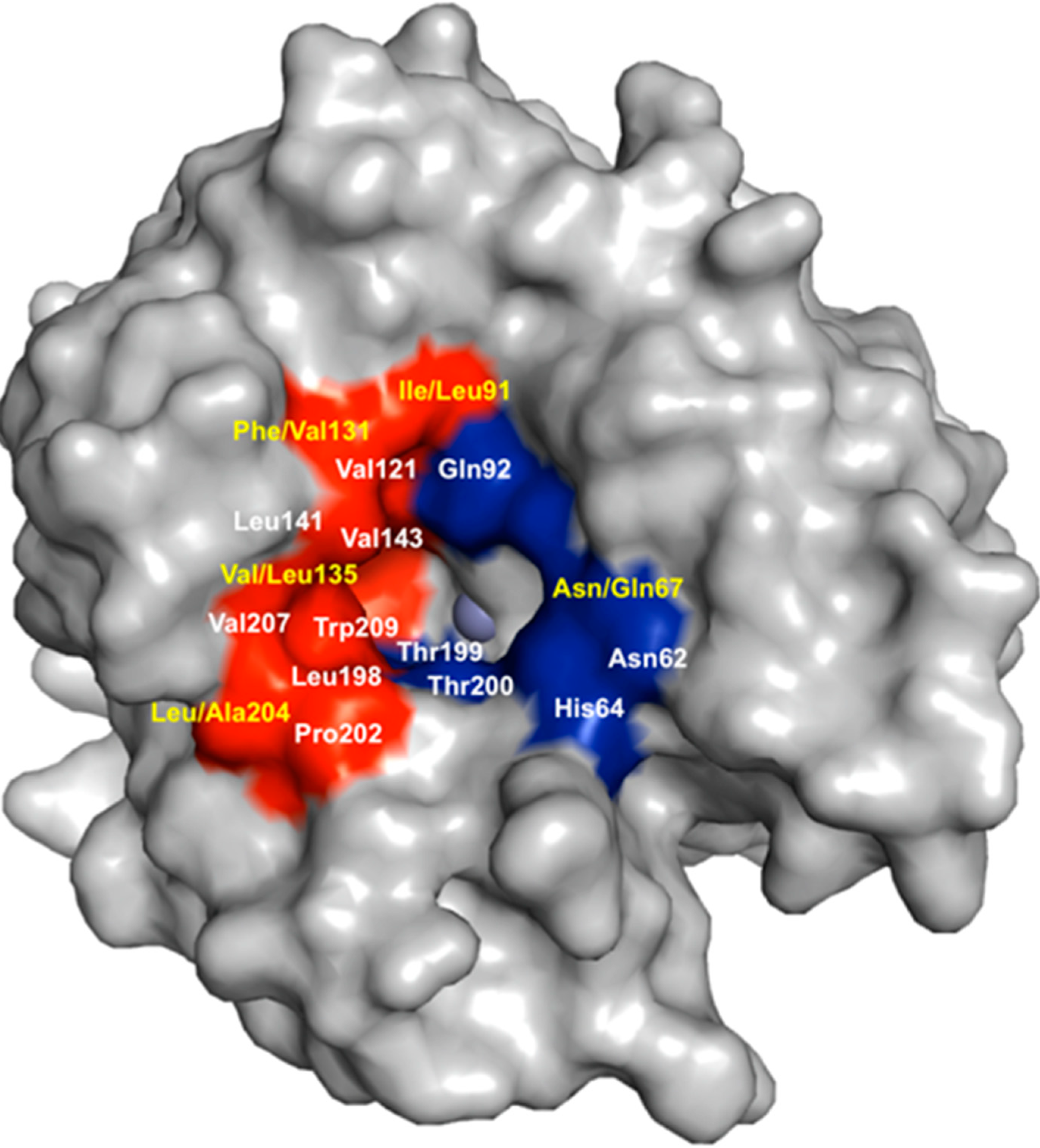 Surface rendition of CA IX (PDB ID: 3IAI). Residues in the hydrophobic (red) and hydrophilic (blue) cleft are as labeled; residues conserved (white) and those that differ (yellow) between CA II and CA IX. Figure made using PyMol [28].