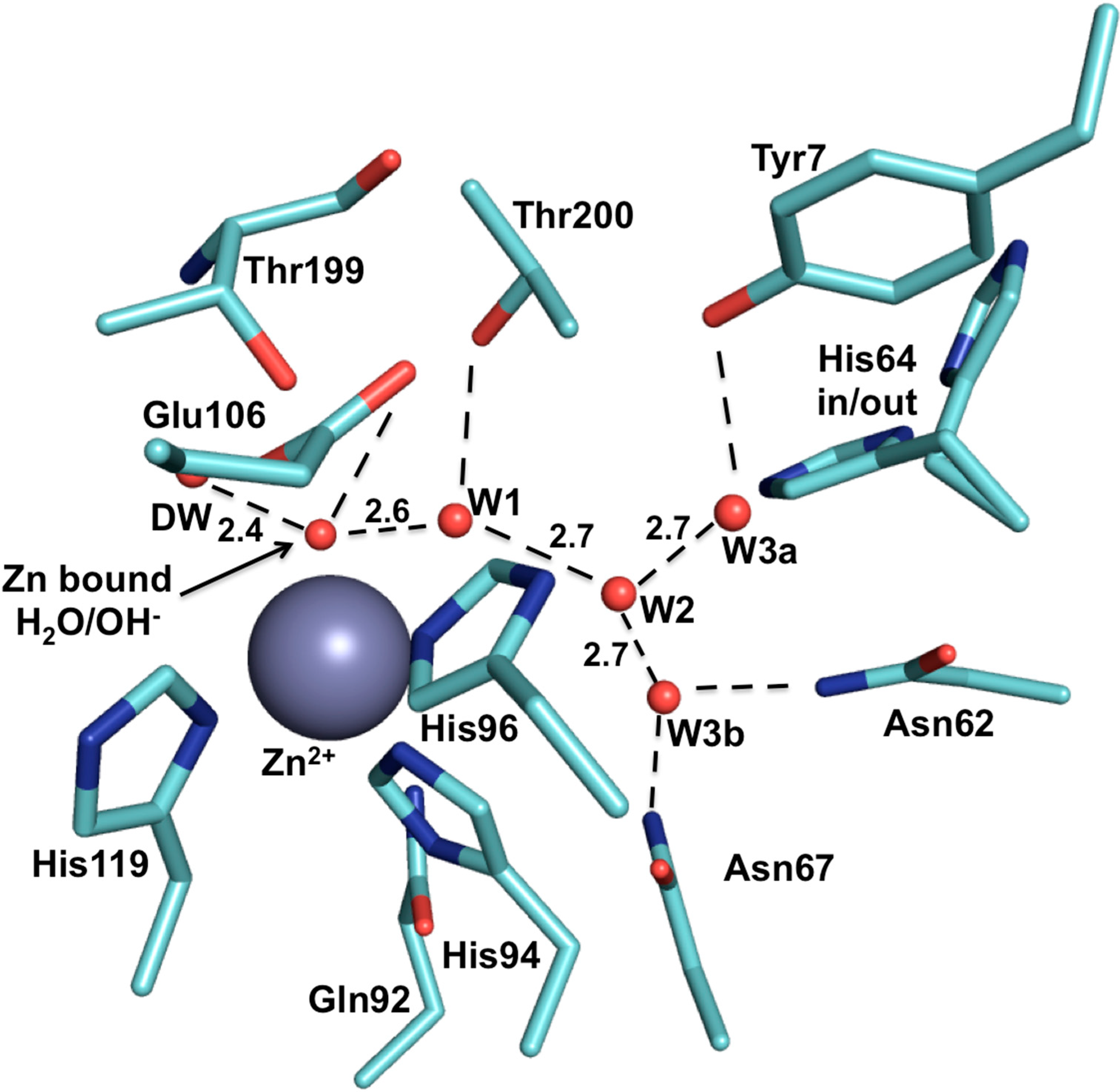 The active site of CA II (PDB ID: 3KS3). The zinc ion is represented by a grey sphere and is coordinated by His 94, 96 and 119, and a H2O/OH− molecule. The zinc bound H2O/OH− binds at a distance of 1.9 Å away from the zinc ion. Water (W) are represented by red spheres while hydrogen bonds (H-bonds, Å) are represented by dotted lines. This figure was made using PyMol [28].