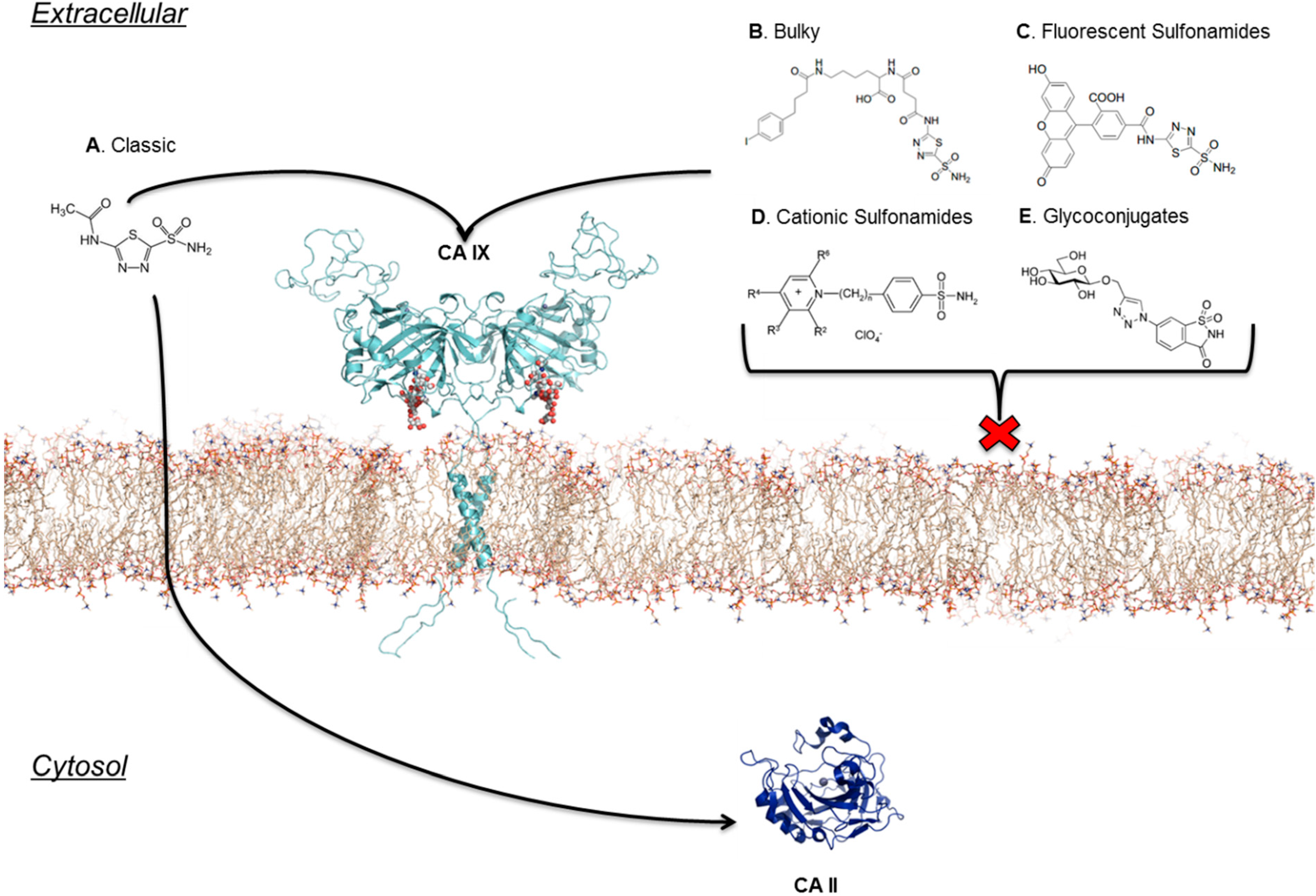CAIs designed to target the extracellular CA domain of CA IX as compared to classic inhibitors. (A) Classic (B) Bulky (C) Fluorescent (D) Cationic sulfonamides (E) Glycoconjugates all show extensive differences in terms of CA IX specific targeting potential.(Figure was adapted from [67] and made using PyMol [28] and ChemDraw [68] software packages).