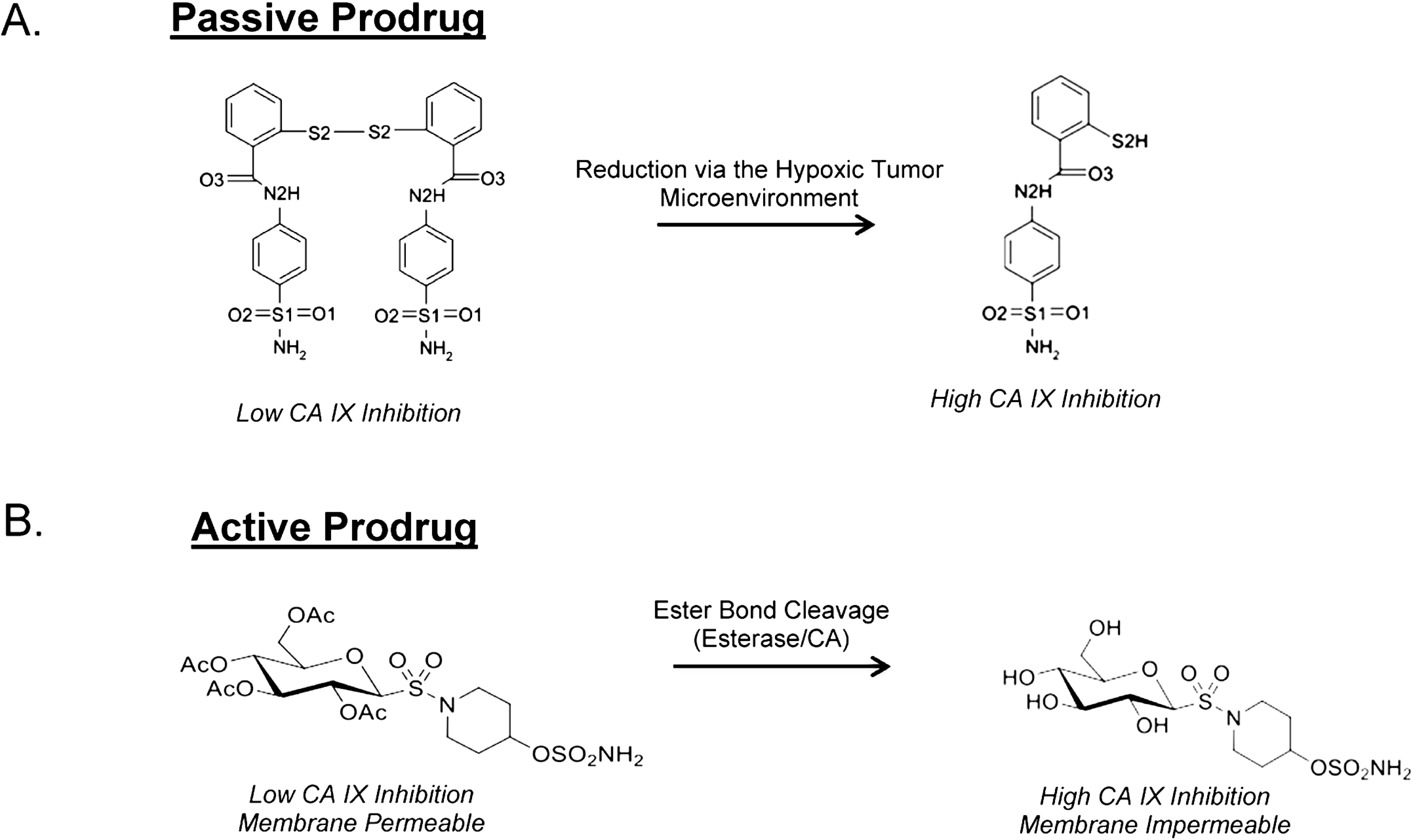 Prodrug CAIs. (A) Passive prodrug CAIs (4-(2-mercaptophenylcarboxamido) benzenesulfonamide) utilizes the microenvironmental changes to become unmasked. (B) Active prodrug CAIs require the presence of esterase activity either from ubiquitous esterases or the weak esterase activity of CAs to become unmasked.