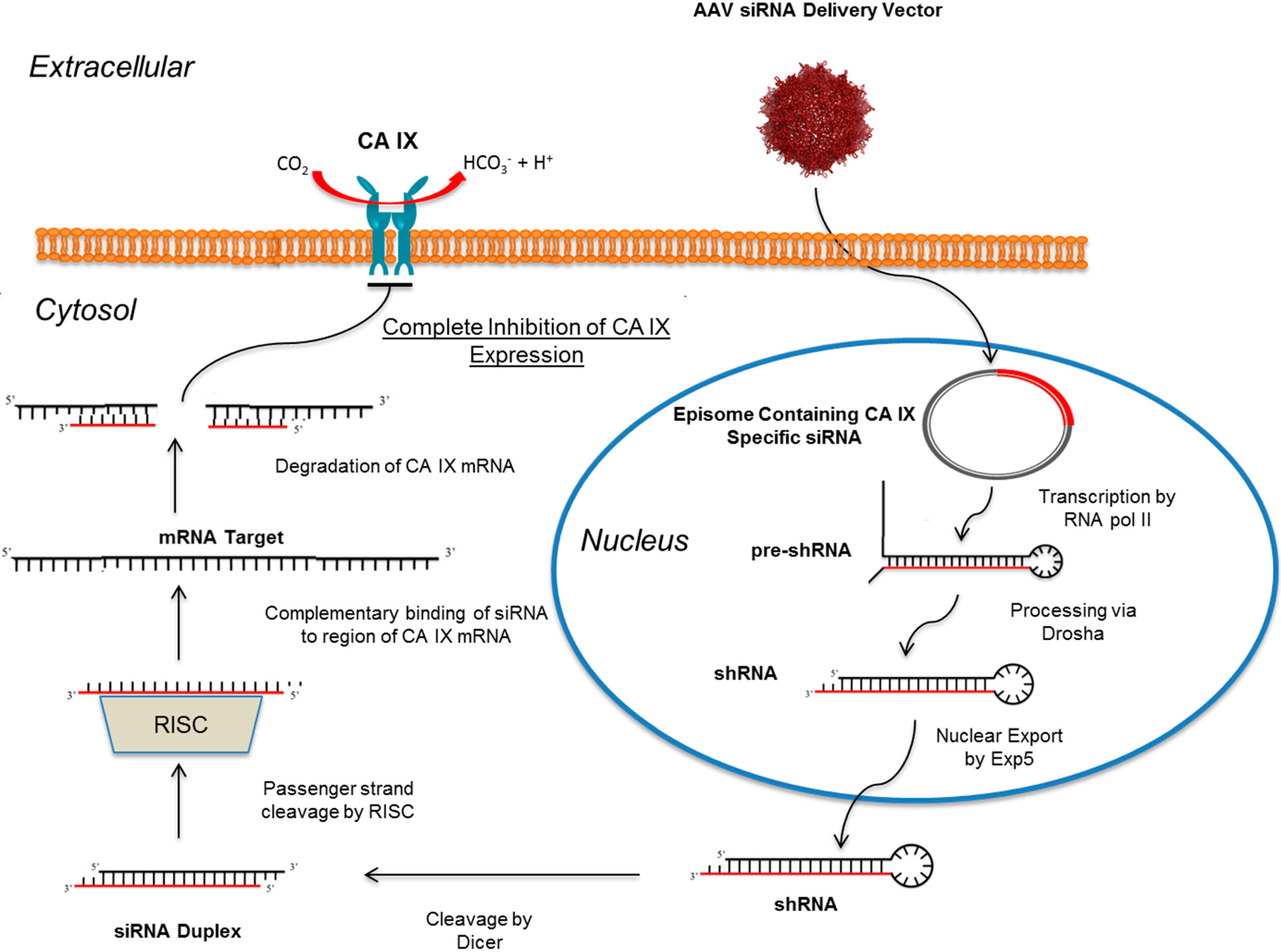 Pathway of AAV-mediated siRNA delivery to target CA expression in a tumor cell. The siRNA construct is delivered via a transduced AAV vector and its episome is trafficked to the nucleus. Within the nuclease the episomal DNA is transcribed by RNA pol II to produce a pre-shRNA construct that is further processed and transported to the cytosol where it becomes an siRNA duplex. The siRNA duplex is then processed by RISC and escorted to the specific mRNA region encoding for CA IX. Once bound, via complementary base-pairing, the CA IX mRNA is degraded and expression of CA IX is abolished. (This figure was adapted from [116] and AAV3B; PDB ID: 3KIC [117]).