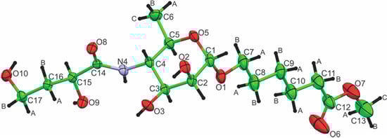 Single crystal X-ray diffraction intensities were collected using a Bruker Kappa APEX II 4K CCD (Madison, WI, USA) 4-circle automated diffractometer and MoKα radiation. During data collection, the sample was cooled to 200(2) K using a stream of cold N2 gas generated with an Oxford Cryosystems 700 low-temperature system. The crystal structure was solved [18] using SHELXS-97 and refined using SHELXL-97 [19]. The absolute configuration of the structure was established from the known configuration of the α-d-mannopyranoside ring, and the absolute structure (Flack) parameter, although not definitive, due to the weak anomalous scattering contributions with MoKα radiation, is consistent with the assignment. Hydrogen atoms attached to O and N atoms were located in a difference Fourier map and refined with isotropic temperature factors. The positions of H atoms attached to C atoms were calculated using idealized sp3 geometry and included as riding atoms in the least-squares refinement. For the methyl hydrogens, the torsion angle about the C-Me bond was optimized during the refinement.