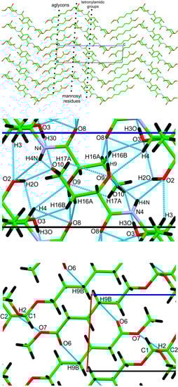 Crystal packing and hydrogen bonding, viewed along the b-axis of the unit cell. The upper drawing has the aglycon units along the a-axis, and the tetronylamido groups are located at the center of the unit cell. The mannosyl units are at about ¼ (and ¾) of the c-axis. The middle and lower figures show the details of the hydrogen bonding near the center and corner of the cell, respectively. The H2 atoms are hidden behind the C1-C2 bonds.