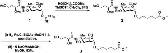 5-(Methoxycarbonyl)pentyl-3-O-benzyl-4-(2,4-di-O-acetyl-3-deoxy-l-glycero-tetronamido)-4,6-dideoxy-2-O-levulinoyl-α-d-mannopyranoside (2). A mixture of Compound 1 (5.7 g, 8.36 mmol) [8], methyl 6-hydroxyhexanoate [9] (1.34 g, 9.19 mmol) and 4 Å MS (1.0 g) in CH2Cl2 (anhydrous) was stirred at room temperature under Ar for 30 min. TMSOTf (83 μL, 0.46 mmol) was added, and the mixture was stirred for another 5 h. TLC (Rf = 0.3, EtOAc–hexane 1:1) showed that all of 1 was consumed and that a slightly more polar product was formed. Et3N (0.5 mL) was added, and the mixture was filtered through a Celite pad. The filtrate was concentrated, and chromatography gave Compound 2 (4.7 g, 84%). The analytical data (1H-, 13C-NMR, ESI-MS) of 2 agreed with those reported [10].