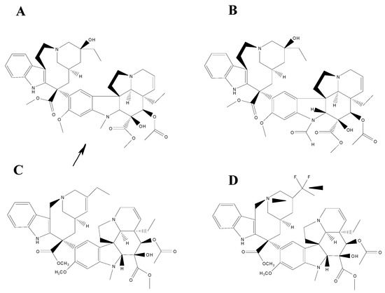 Vinblastine is used in particular for the treatment of Hodgkin’s disease, besides lymphosarcoma, choriocarcinoma, neuroblastoma, carcinoma of breast and lung, and lymphocytic leukemia [34,35]. Anhydrovinblastine, the direct precursor of vinblastine, also showed significant in vitro cytotoxic effect against human non-small cell lung cancer C4 and human cervical carcinoma, human leukemic cells, and A431 human carcinoma cells [36].
