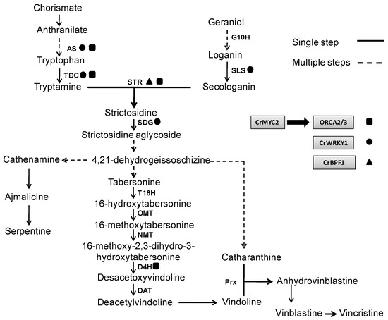 - Memelink, J.; Gantet, P. Transcription factors involved in terpenoid indole alkaloid biosynthesis in Catharanthus roseus. Phytochem. Rev. 2007, 6, 353–362. [Google Scholar] [CrossRef]