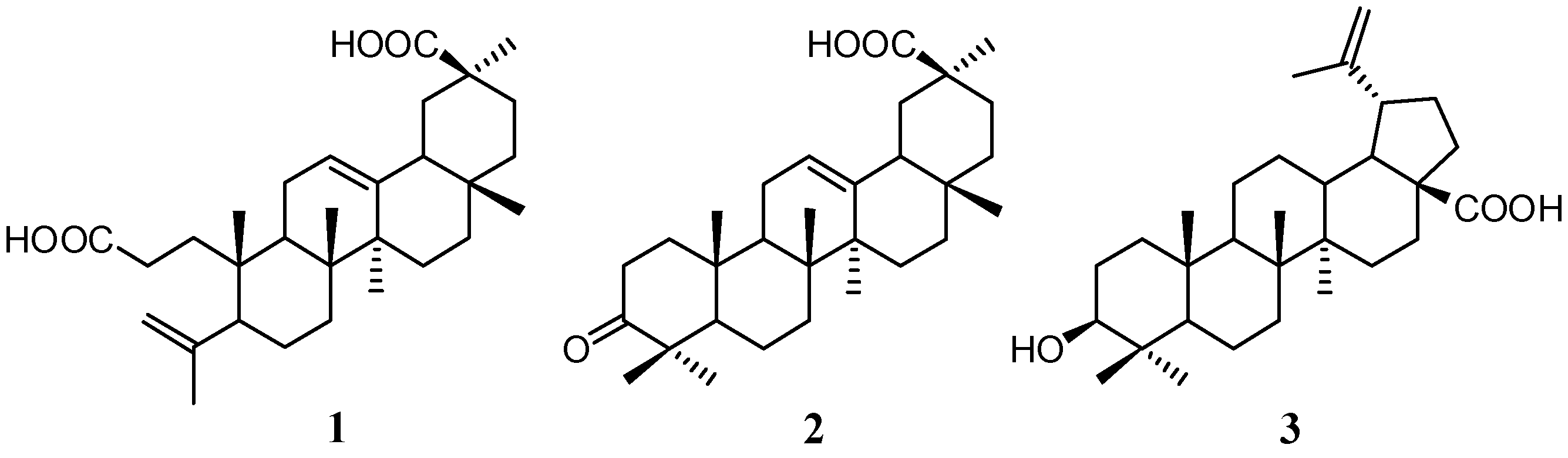 Koetjapic acid (1) has various pharmacological activities, including growth inhibition of multi-drug resistant bacteria Staphylococcus aureus and Pseudomonas aeruginosa (minimum inhibitory concentration, MIC of 12.5 and 6.25 μg/mL, respectively) [34], inhibition on Epstein-Barr virus antigen activation [36] and inhibition of DNA polymerase beta (IC50 20 μM) [37]. This compound also preserved high viability of the Raji cells [36]. Meanwhile, Nick et al. [18] investigated the antibacterial activity of 3-oxoolean-12-en-30-oic acid (2) from D. papuana that inhibited the growth of Bacillus subtilis, Escherichia coli, and Micrococcus luteus. Some papers have reported the anti-inflammatory, antileukemic and anti-HIV activities of betulinic acid (3) [38,39,40,41,42,43]. Treatment of hPBMCs with this compound alone did not elicit any PGE2 production and was non-cytotoxic, as indicated by trypan blue assay [53].