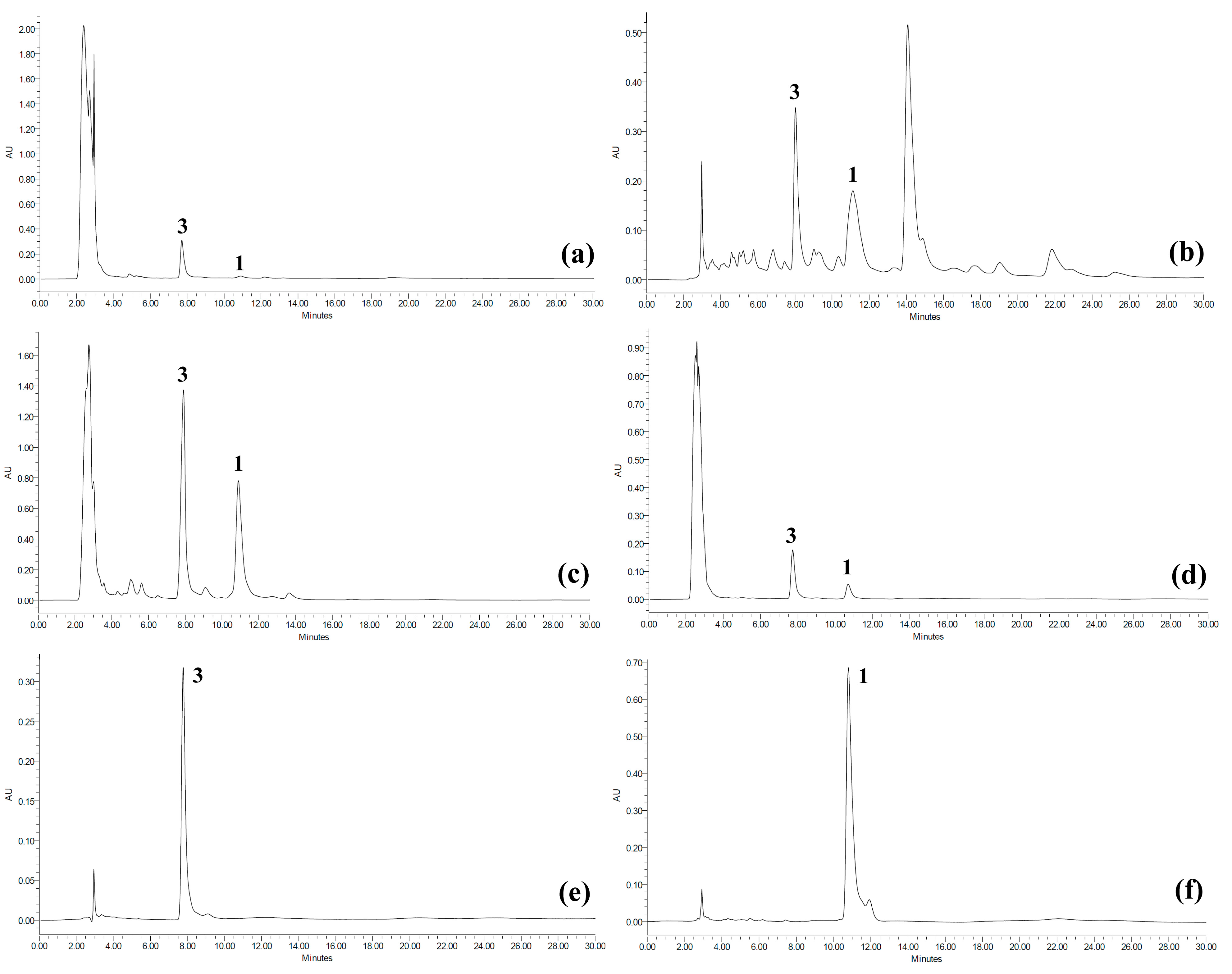 | Sample | Code | Concentration of 1 (mg/g) * | Concentration of 3 (mg/g) * |