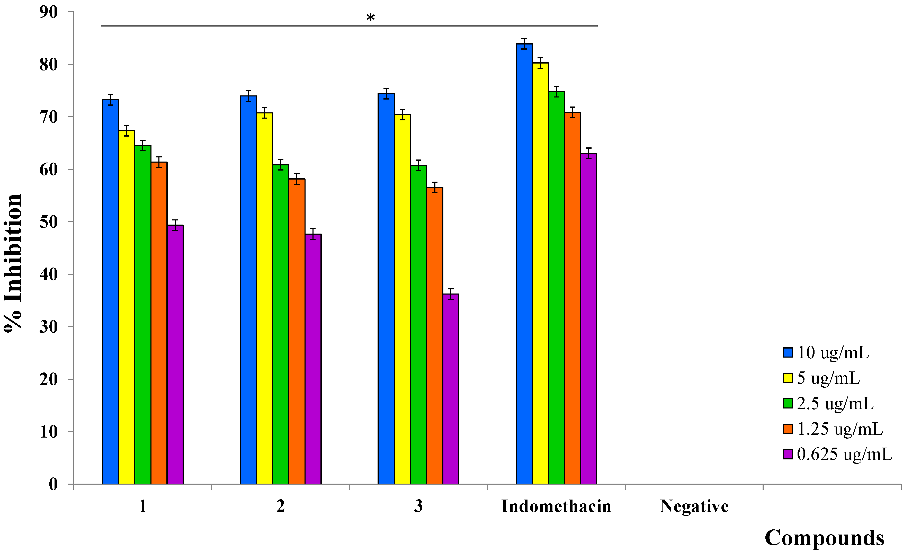 Inhibitory effects of compounds 1, 2, and 3 on PGE2 production by LPS-stimulated human whole blood at various concentrations (value given in mean ± SD; n = 3; * p < 0.05).