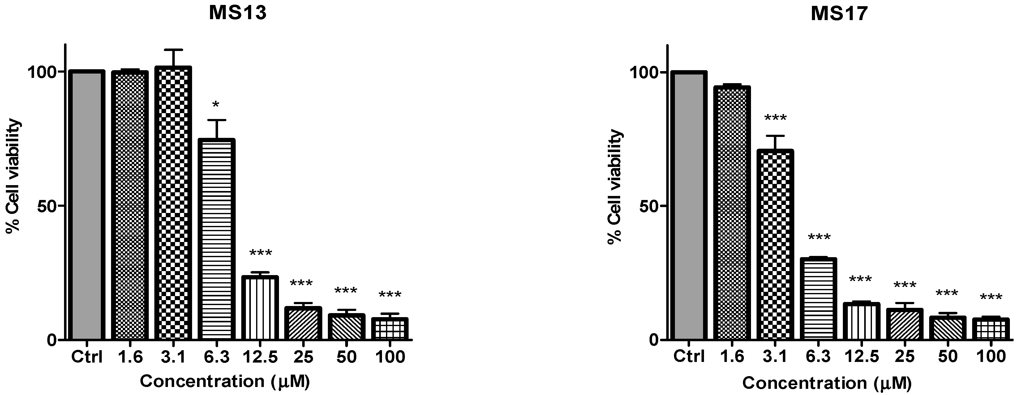in vitro dose-dependent cytotoxicity effect of the curcumin analogues MS13, MS17, MS40E, and MS49, we performed a prostate cancer cell viability assay. The ability of the diarylpentanoids to inhibit growth of the two widely studied and well characterized androgen independent metastatic human prostate cancer cell lines PC-3 and DU 145 were assessed using the MTT assay. This colorimetric assay is based on the ability of mitochondrial enzymes of live cells to reduce MTT to formazan salt. Cells treated with curcumin and DMSO only was used as positive and negative controls, respectively. Among the tested compounds, MS17 showed the strongest dose and time-dependent cytotoxicity effect in both cell lines with a significant decrease in cell viability at 3.1 µM onwards in PC-3 and 6.3 µM onwards in DU 145 cells. This is followed by MS13 with a significant decrease in cell viability at doses of 6.3 µM and 12.5 µM in PC-3 and DU 145 cell respectively. However, the other compounds MS49 and MS40E exhibited moderate growth inhibitory effect in both cell lines. MS49 revealed a significant decrease in cell viability at doses of 12.5 µM and 25 µM onwards in PC-3 and DU 145 cells respectively whereas, MS40E at a dose of 50 µM onwards in both cell lines. Curcumin, the parent compound displayed a significant cell inhibitory effect at a dose of 50 µM (