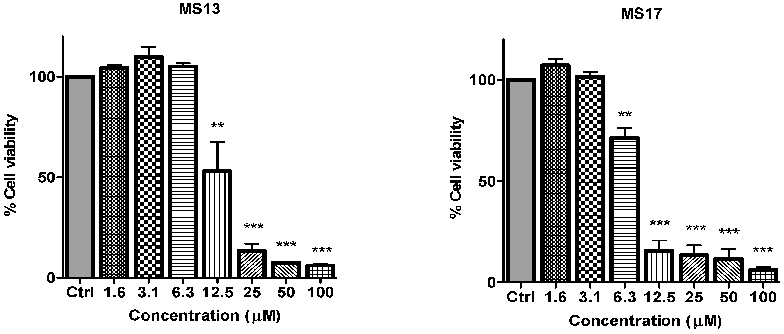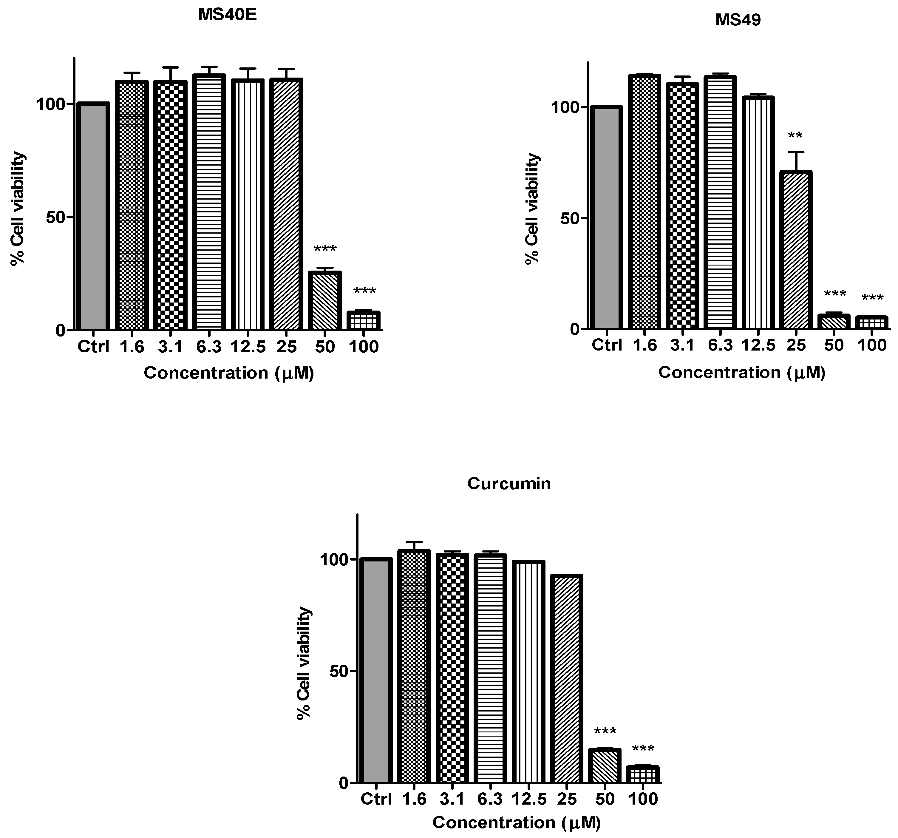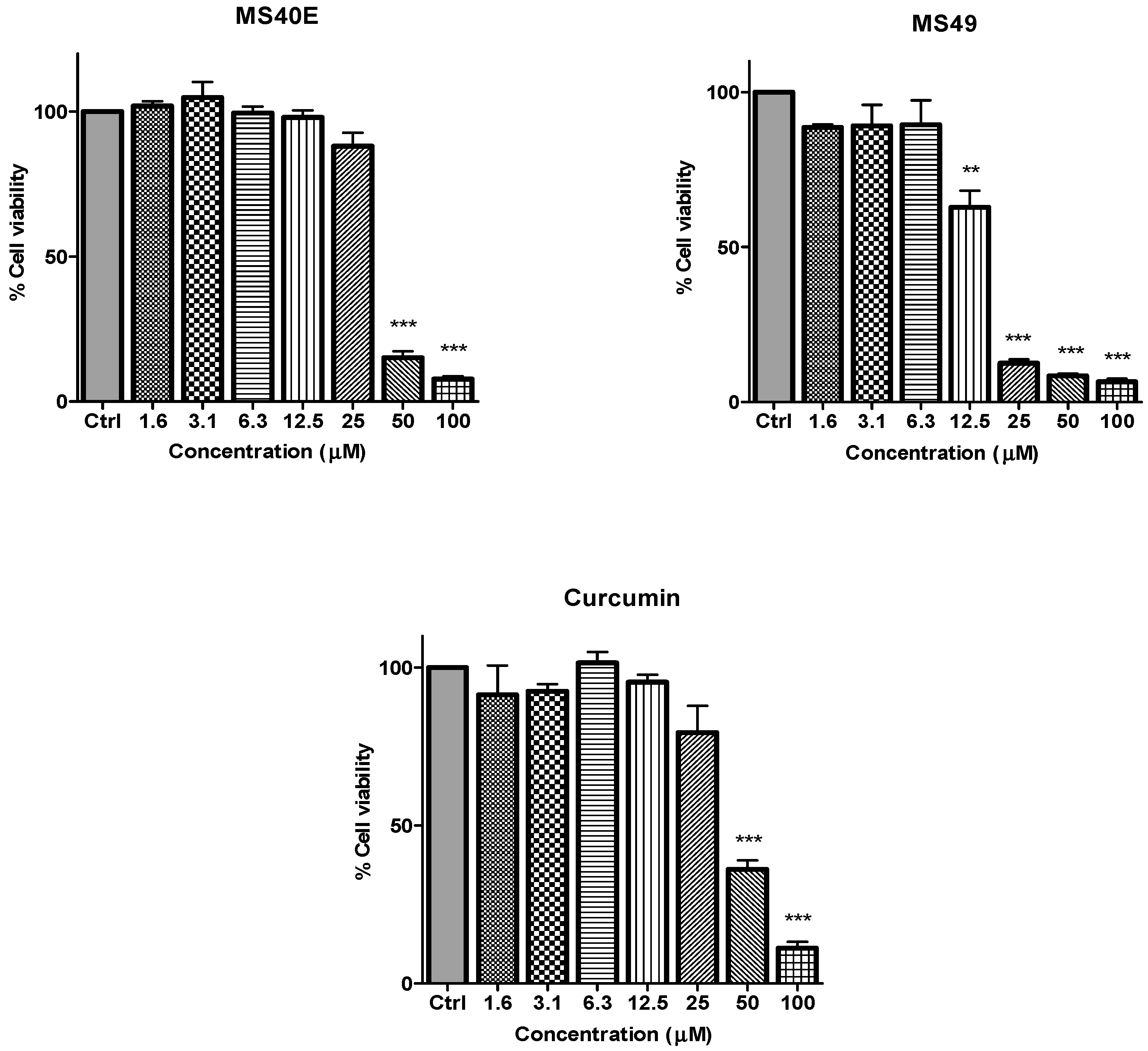 The inhibitory effects of cell viability by curcumin, MS17, MS13, MS40E and MS49 in DU 145 cell line compared to untreated sample (Ctrl). Results are expressed as means ± S.E. from three independent experiments. Percentage cell viability and comparison between data sets performed using ANOVA. ** p < 0.01 and *** p < 0.001 indicates statistically significant differences between the means of values obtained with treated vs. untreated cells.