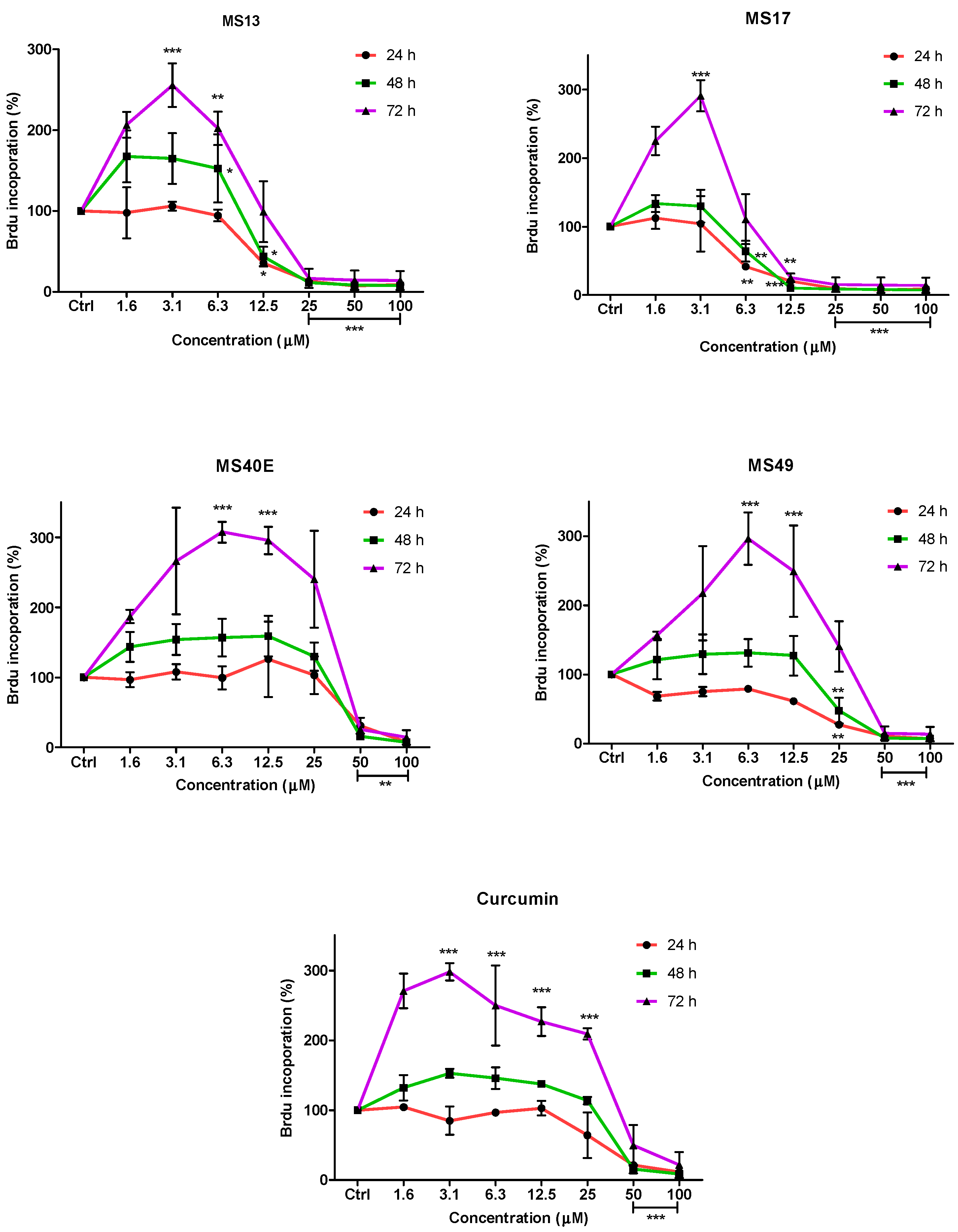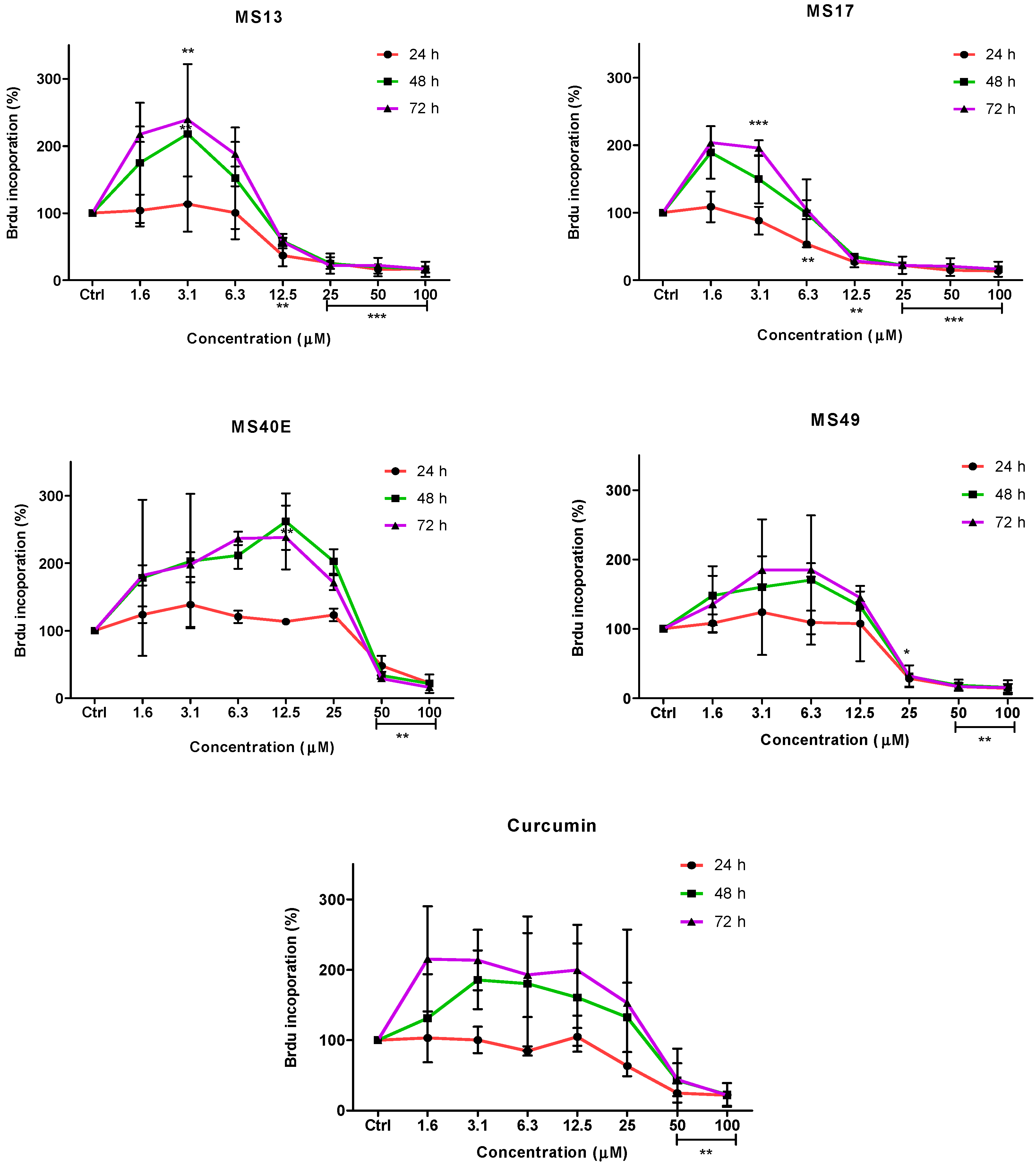 Anti-proliferative effect of MS13, MS17, MS40E, MS49 and curcumin on PC-3 cells at 24, 48 and 72 h. Results are expressed as means ± S.E. from three independent experiments. Percentage BrdU incorporation and comparison between data sets performed using ANOVA. * p < 0.05, ** p < 0.01 and *** p < 0.001 indicates statistically significant differences between the means of values obtained with treated vs. untreated cells (control).