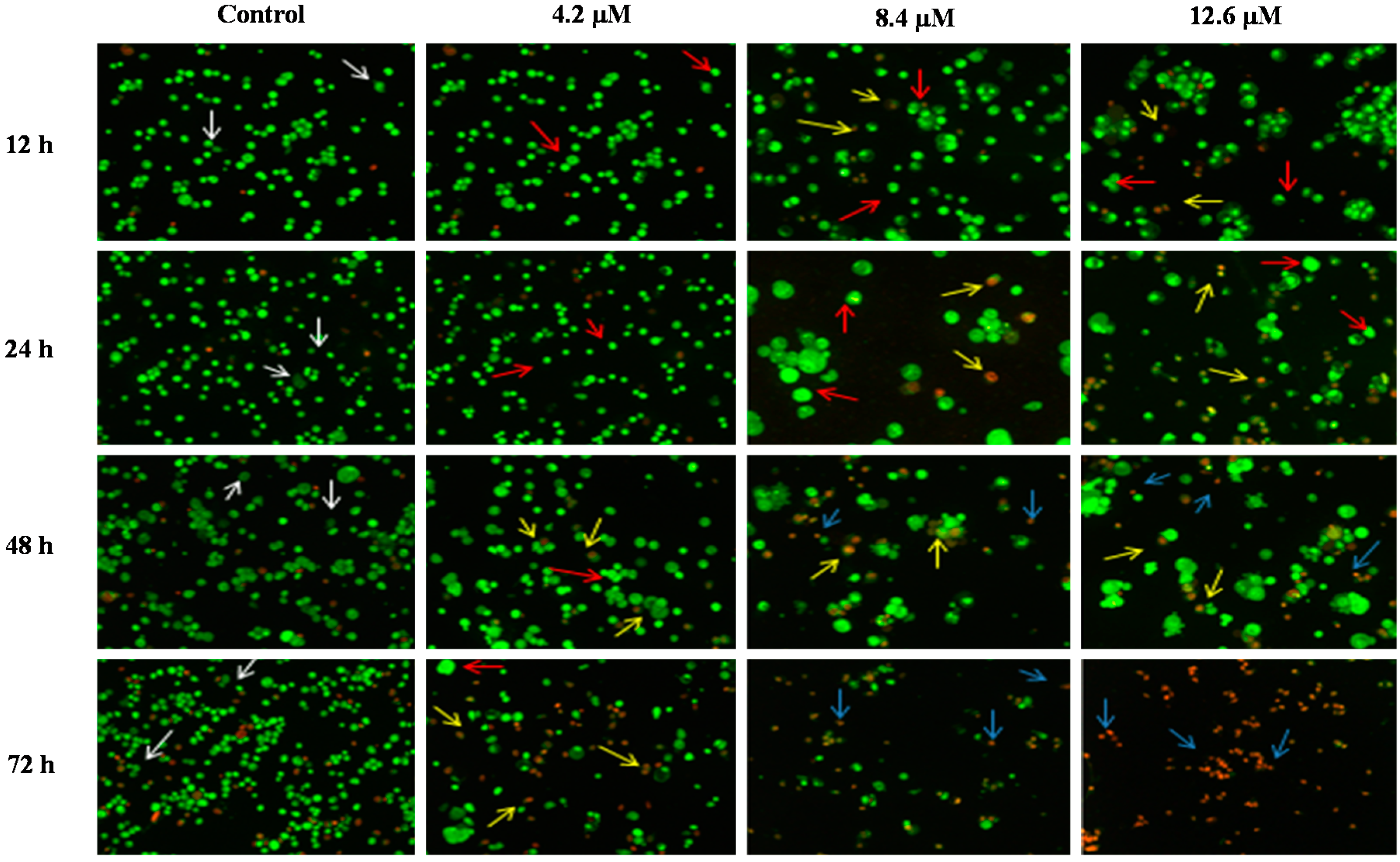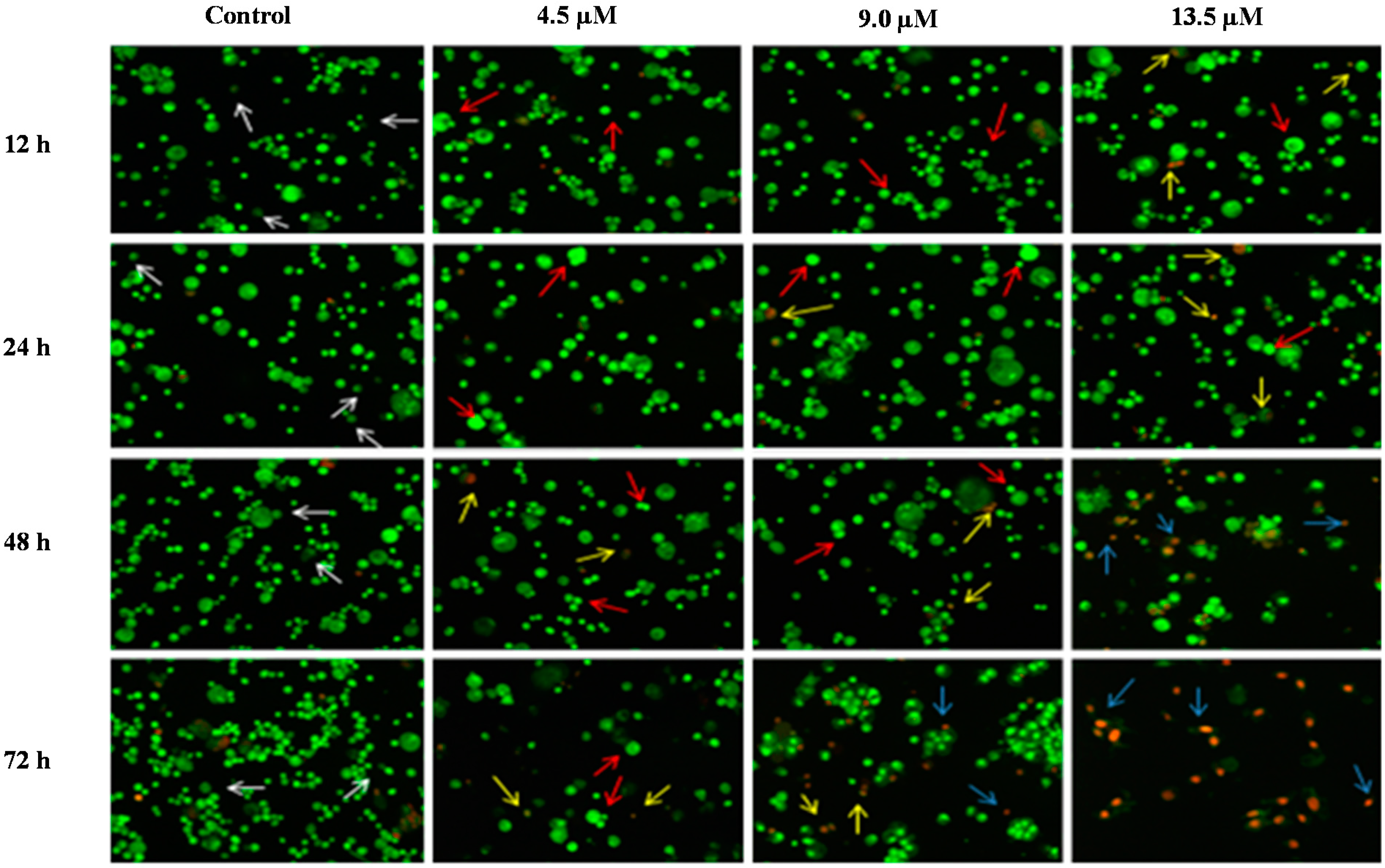 Detection by fluorescent microscope of acridine orange/ethidium bromide double stained DU 145 cells treated with MS17 for 12, 24, 48 and 72 h. Untreated viable cells are uniformly pale-green (white arrow); Early apoptotic cells shows characteristic loss of membrane integrity and chromatin condensation, stained bright-green to yellow (red arrow); Late apoptotic cells stained yellow-orange or red colour, with a condensed or fragmented chromatin (yellow arrow); Necrotic cells showed bright orange-red in appearance (blue arrow). Magnification 100×.
