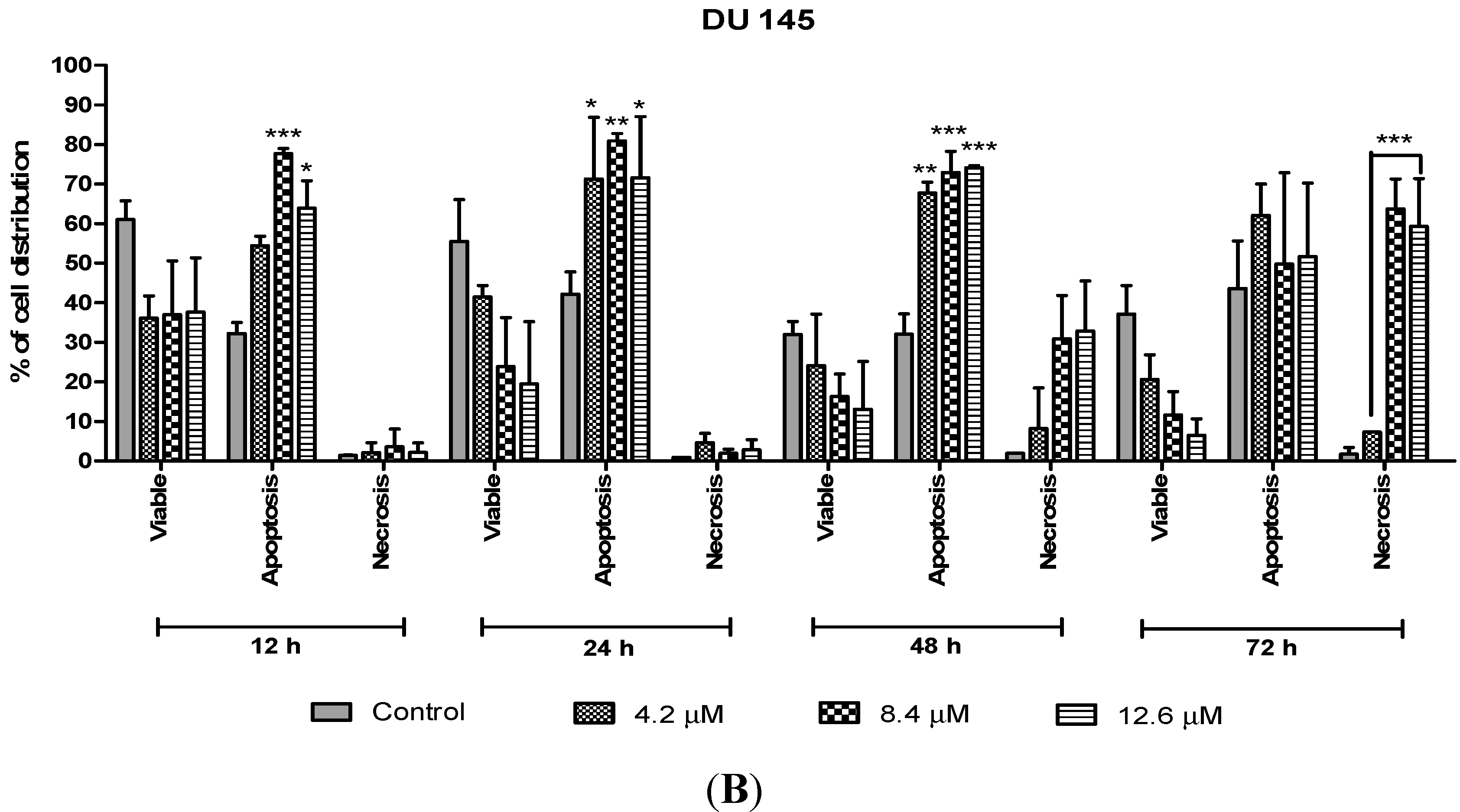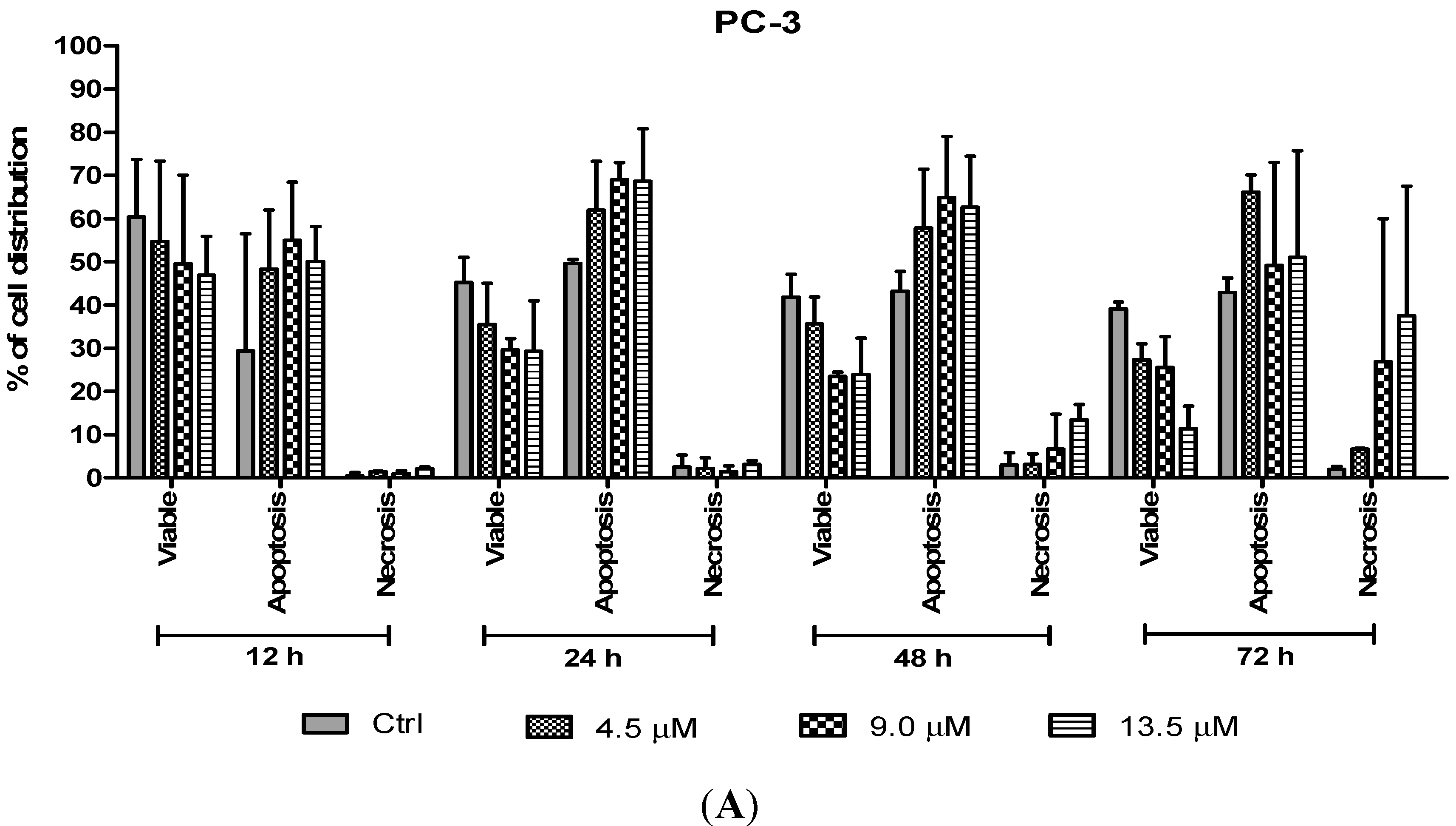 Figure 8, the percentage of viable cells decreased upon exposure to longer incubation times in both cell lines. Between time points, there was an increase of apoptosis in all concentrations compared to the untreated samples (control). The results showed a comparatively higher percentage of cells undergoing apoptosis at 24 and 48 h as treatment doses increase in both cell lines. PC-3 cells treated with doses of 4.5 µM, 9.0 µM and 13.5 µM at 24 and 48 h induced approximately 60%–70% apoptotic cells. Although apoptosis was relatively high at 48 h, necrotic cells were noted to increase at this time point. Treatment with all three doses at 48 and 72 h showed an increase approximately between 5% and 15% of necrotic cells compared to 12 and 24 h with less than 5% of necrotic cells.