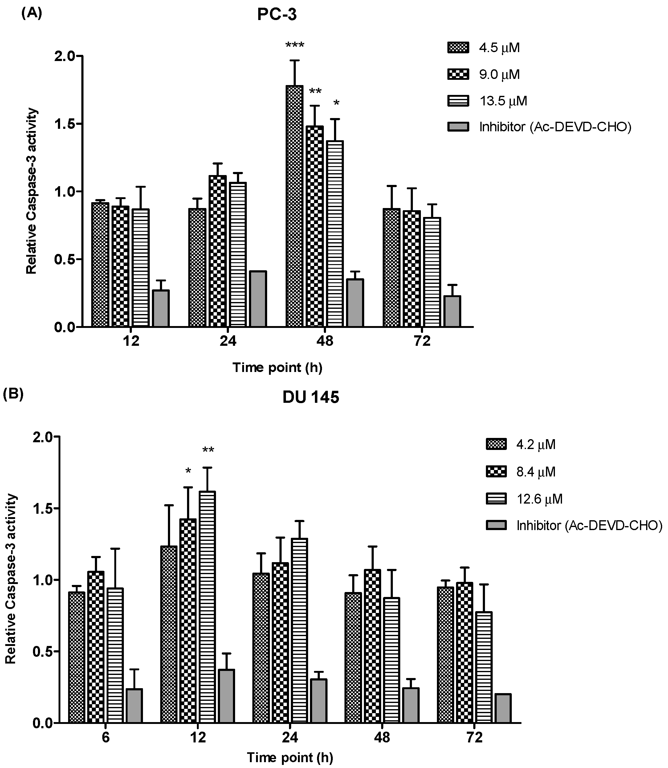 Figure 9, PC-3 cells showed a significant increase of caspase-3 activity at 48 h time point following treatment with 4.5, 9.0 and 13.5 µM of MS17. However, there were no significant differences of caspase-3 activity noted between different concentrations at 12, 24 and 72 h. In DU 145 cells an increase in caspase-3 activity was noted at 12 h after treatment with MS17. Caspase-3 activity was significant at 8.4 and 12.6 µM compared to 4.2 µM. However, there were no significant differences of caspase-3 activity between different concentrations at 6, 24, 48 and 72 h. Treatment with the caspase-3 inhibitor, Ac-DEVD-CHO in both cell lines showed relatively low expression levels at all time points for both cell lines, confirming inhibition of caspase-3 activity.