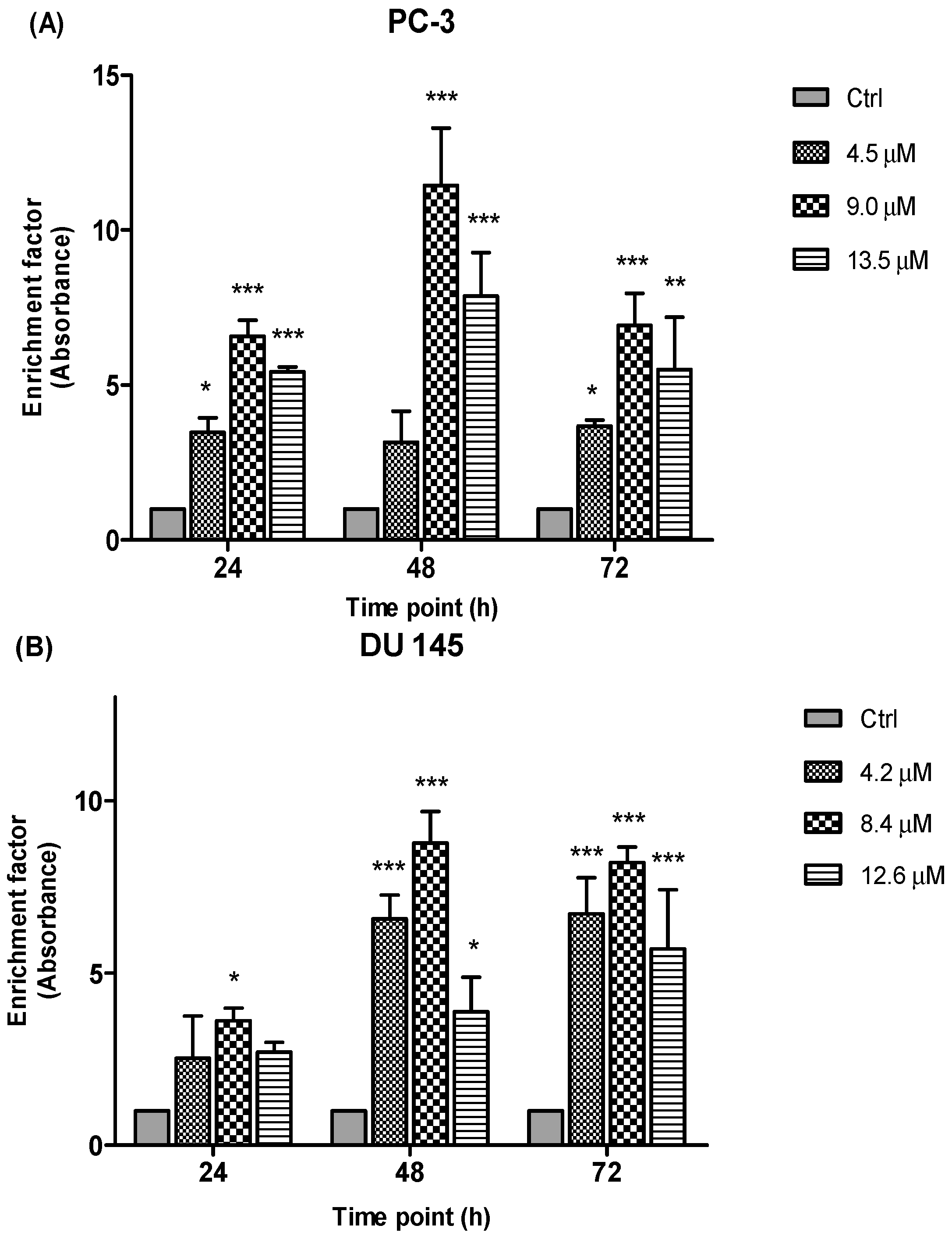 Figure 10) are shown as ratio of absorbance calculated according to the formula introduced in the previous section. The enrichment factor value is an indicative of apoptotic activity for all the concentrations and time points. Following the exposure of PC-3 and DU 145 cells to three different concentrations of MS17 treatment mainly 4.5 µM, 9.0 µM and 13.5 µM for PC-3 and 4.2 µM, 8.4 µM and 12.6 µM for DU 145 cells at 24, 48 and 72 h respectively, apoptotic activity was noted at all examined time points and concentrations of MS17 compared to the corresponding untreated cells (control). As seen in