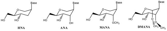 - Van Aerschot, A.; Meldgaard, M.; Schepers, G.; Volders, F.; Rozenski, J.; Busson, R.; Herdewijn, P. Improved hybridisation potential of oligonucleotides comprising O-methylated anhydrohexitol nucleoside congeners. Nucl. Acids Res. 2001, 29, 4187–4194. [Google Scholar] [CrossRef] [PubMed]