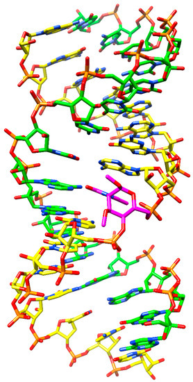 RNA duplex following insertion of a DMANA modification (DMANA modification in purple; picture generated using Chimera (UCSF Chimera—a visualization system for exploratory research and analysis []).