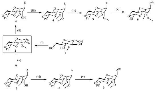 The 1'-O-methylglycosidic protected analogues 4, 6 and 9 (Scheme 1) were obtained starting from ubiquitous methyl glucopyranoside 1, which in three steps was converted to 2 in 51.4% overall yield according to literature procedures []. Herein, regioselective epoxide ring opening of 2 with the sodium salts of uracil or adenine in DMF at 120–130 °C afforded the corresponding altrohexitol derivatives 3 and 7 in 66%–85% yield. Chemoselective methylation of 7 and 3 was accomplished using NaH, MeI in dry THF at low temperature for 1 h to afford the methylated nucleosides 4 and 8 in 65% and 75% yield, respectively. The selective O- vs. N-methylation mainly depends upon the dielectric constant of the solvent [,] and the stability of sodium-enolate chelation []. Hence, low dielectric constant and high chelation stabilizing capacity of THF afforded a higher O-selectivity compared to DMF. The one pot conversion of compound 3 to the triazolide derivative [] using 1,2,4-triazole, POCl3, and triethylamine, and subsequent treatment with aqueous ammonia/dioxane (1:1) at ambient temperature for 18 h yielded the cytidine derivative (5) with 58% (overall yield for 2 steps). Base protection of 5 and 8 using benzoylchloride in pyridine at rt for 3 h afforded 6 and 9 in 83 and 88% yield, respectively.