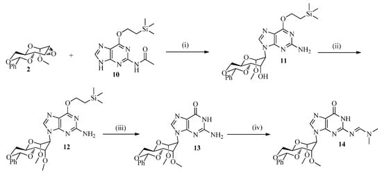 3.13. 4',6'-O-Benzylidene-1',3'-di-O-methyl-2'-deoxy-2'-(N2-(dimethylamino)methylene-guanin-9-yl))-d-altropyranoside (14)