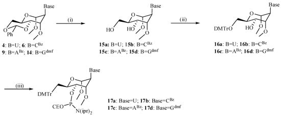 Deprotection of the benzylidene protecting group under mild conditions using AcOH:H2O (3:1) at 45 °C for 12 h afforded 15a–d in 50%–94% yield (Scheme 3), which was followed by classical dimethoxytritylation and phosphitylation. Hereto, the nucleosides 15a–d were selectively protected at the 6'-OH by reaction with DMTrCl in pyridine at rt for 3 h to furnish the corresponding protected derivatives 16a–d in 74%–93% yield. Phosphitylation of 16a–d at the 4'-OH with 2-cyanoethyl N,N-diisopropylchlorophosphoramidite in anhydrous CH2Cl2 at 0 °C for 1.5 h afforded the corresponding phosphoramidite building blocks 17a–d in 65%–93% yield, to be used for oligomer assembly. Assembly of all oligonucleotides and purification was carried out as described before [].