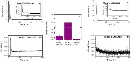 3.2. Characterization of NO Release from SNAC, NaNO2 and NaNO3 Solutions