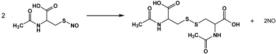 - De Oliveira, M.G.; Shishido, S.M.; Seabra, A.B.; Morgon, N.H. Thermal stability of primary S-nitrosothiols: Roles of autocatalysis and structural effects on the rate of nitric oxide release. J. Phys. Chem. A 2002, 106, 8963–8970. [Google Scholar] [CrossRef]
