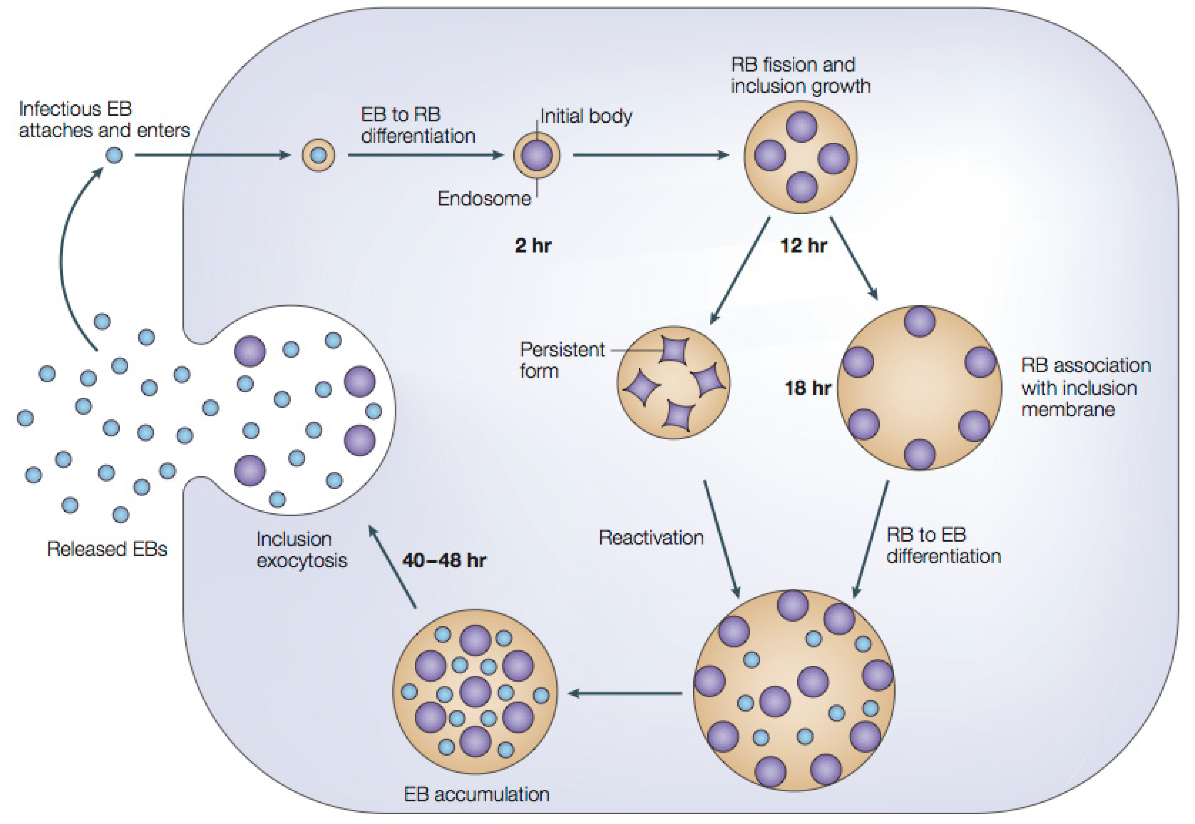 The developmental cycle of Chlamydia trachomatis. An infectious elementary body (EB) attaches and enters a eukaryotic host cell. The EB is surrounded by an endosomal membrane to form an inclusion. Within the inclusion, the EB differentiates into an active reticulate body (RB), which then divides by binary fission. Within 40–48 h the RBs transform back into infective EBs which are released to infect neighboring cells. If growth inhibitors are present during this process, intracellular C. trachomatis bacteria develop a non-replicating persistent form, which reverts to an infectious form upon removal of the inhibitor. Adapted with permission from [16]. Copyright 2005 Nature Publishing Group.
