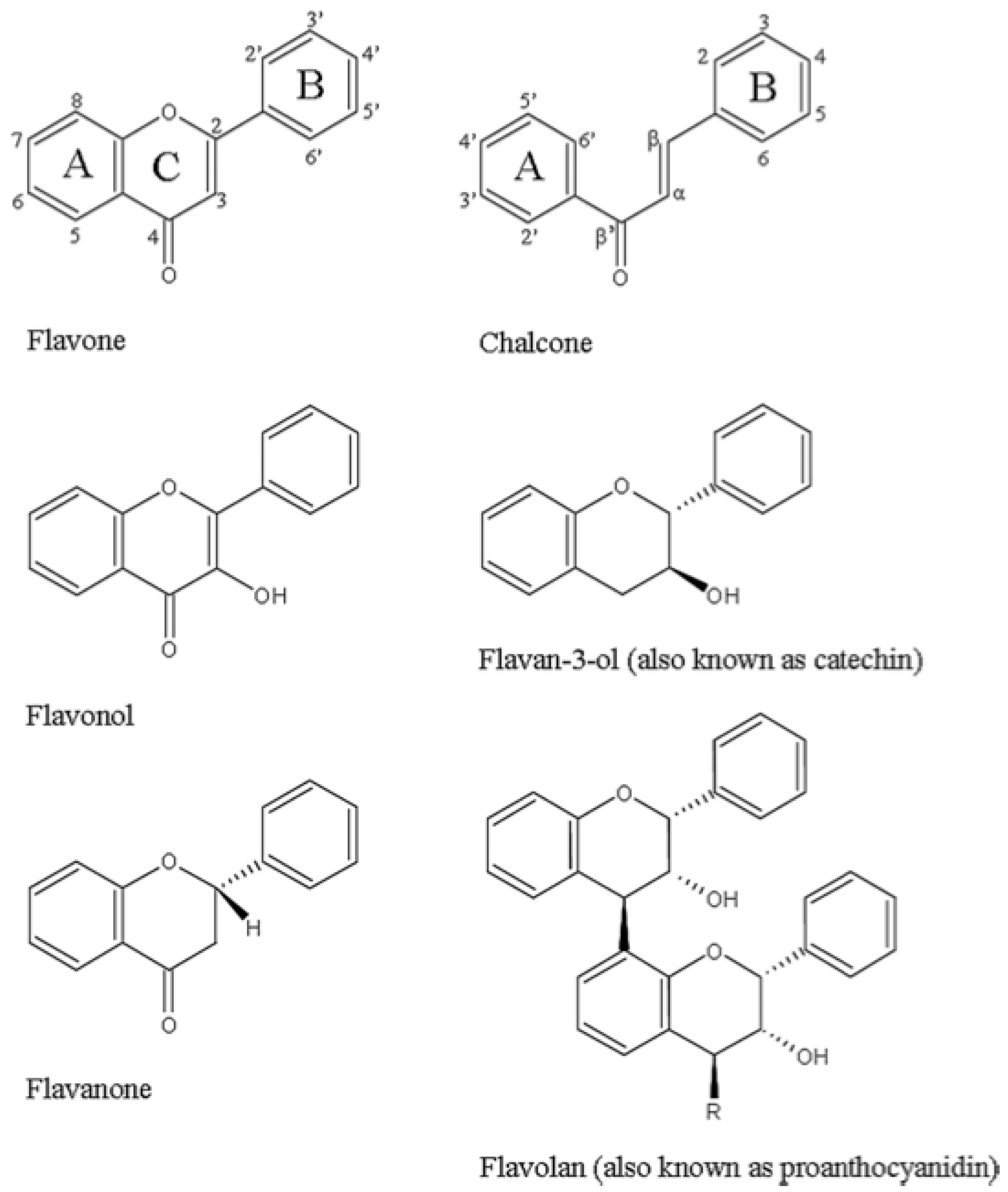 Structures of six of the main classes of antibacterial flavonoids, namely flavones, flavonols, flavanones, chalcones, flavan-3-ols, and flavolans. Adapted with permission from [45]. Copyright 2011 Elsevier B.V. and the International Society of Chemotherapy.
