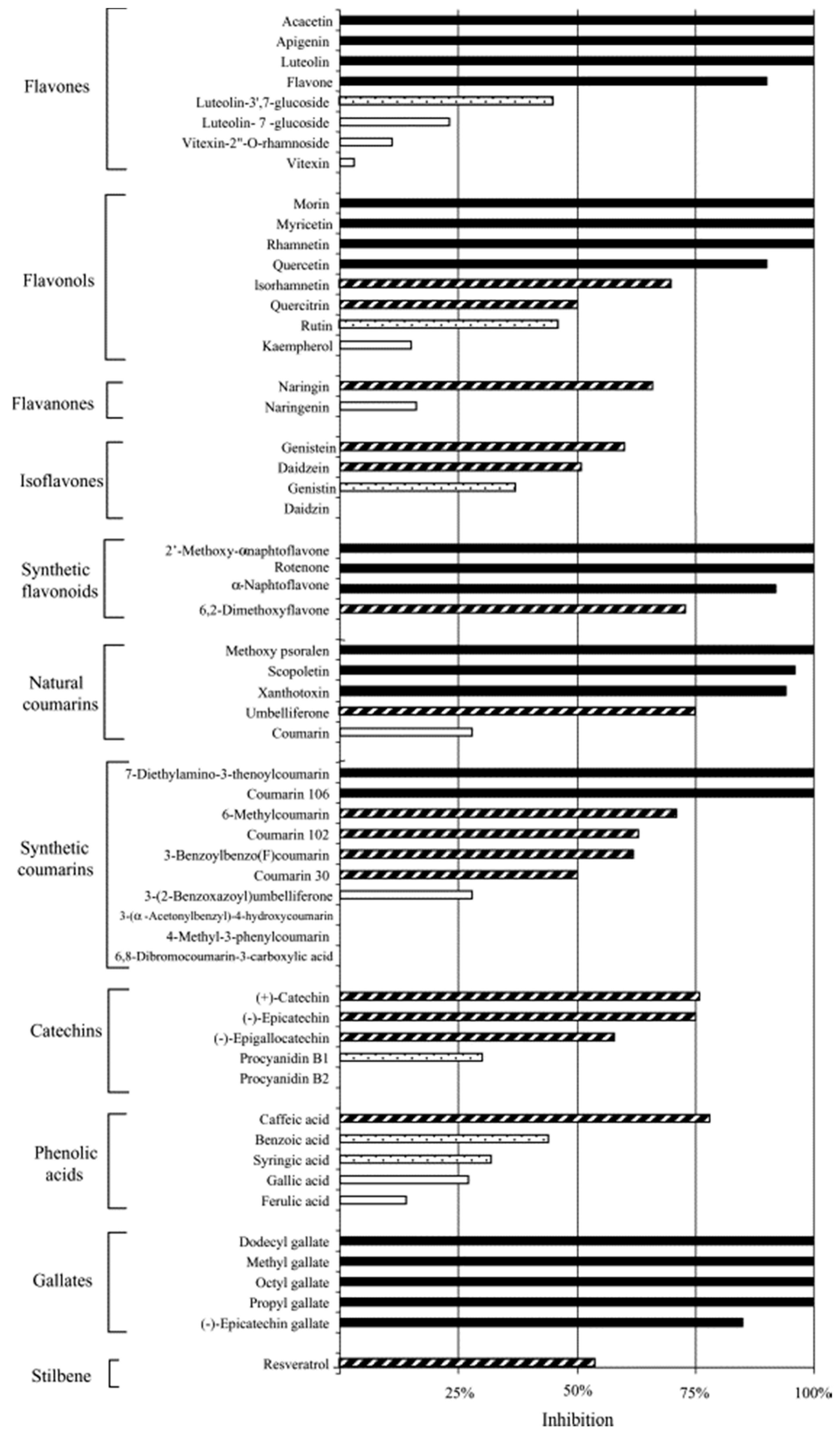 Average inhibition percentages of natural or natural-based polyphenols and synthetic derivatives against C. pneumoniae at 50 μM concentration (n = 4 or more). Categories of activity are determined to be: highly active (black bar) = 85%–100% inhibition compared to DMSO-controls; active (striped bar) = 50%–84%; moderately active (black dotted bar) = 30%–49%; inactive (white bar) = <30%. Adapted with permission from [4]. Copyright 2005 Elsevier Inc.