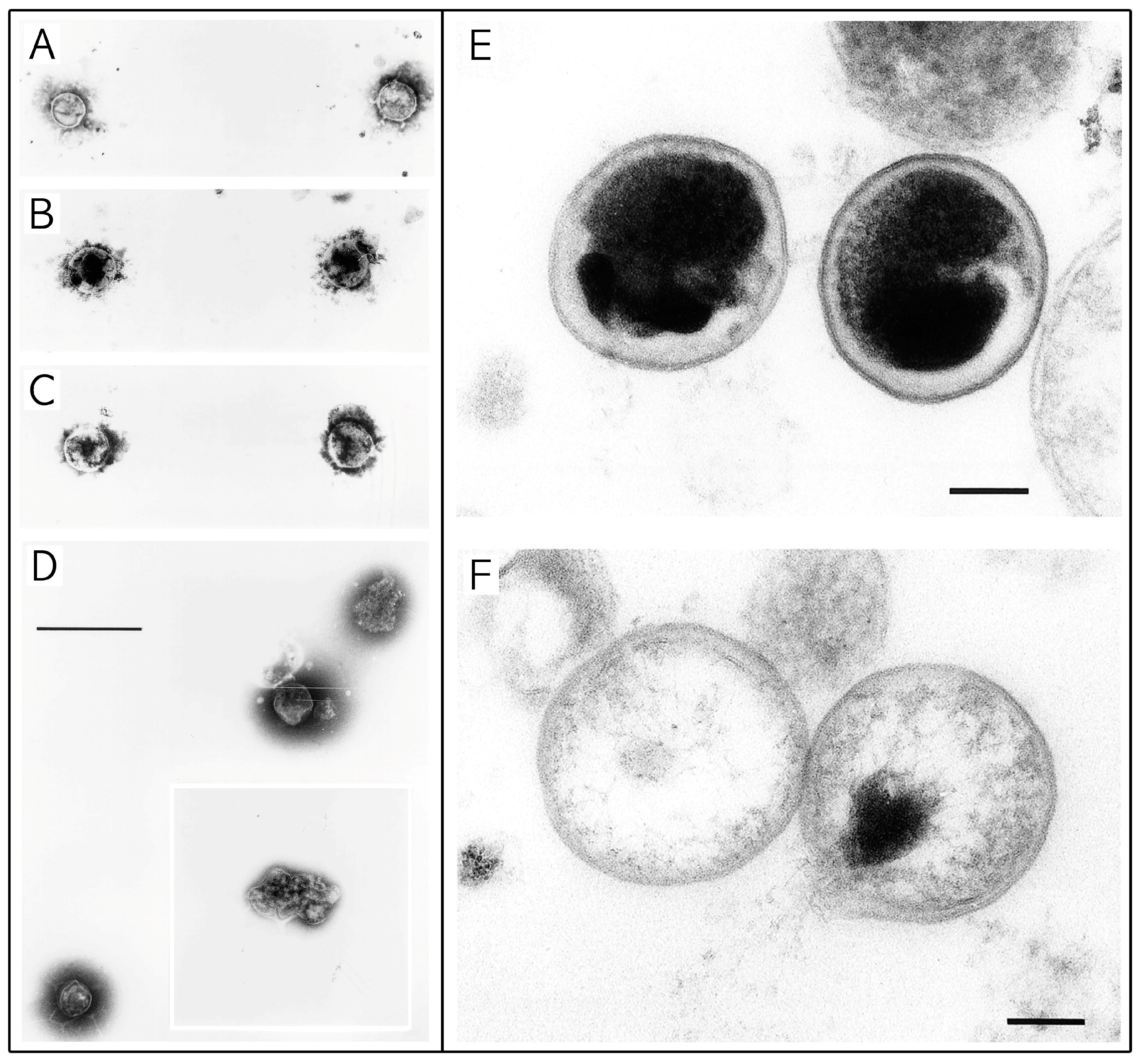 Electron micrographs of C. trachomatis with and without exposure to lipidic compounds. (A–D) Exposure of C. trachomatis EBs to monocaprin. The EBs were untreated (A) or treated with 10 mM monocaprin for 1 min (B), 5 min (C), and 10 min (D). After 10 min, the EBs appear deformed or disrupted (D, inset). Bars, 1 μm. (E,F) Exposure of C. trachomatis EBs to 1-O-hexyl-sn-glycerol. (E) C. trachomatis EBs exposed to sucrose-phosphate-glutamine buffer (SPG) only. (F) EBs exposed to 50 mM 1-O-hexyl-sn-glycerol for 90 min appear as hollow structures. Parts A to D are adapted with permission from [11]. Copyright 1998 American Society for Microbiology. Parts E and F are adapted with permission from [17]. Copyright 1998 American Society for Microbiology.