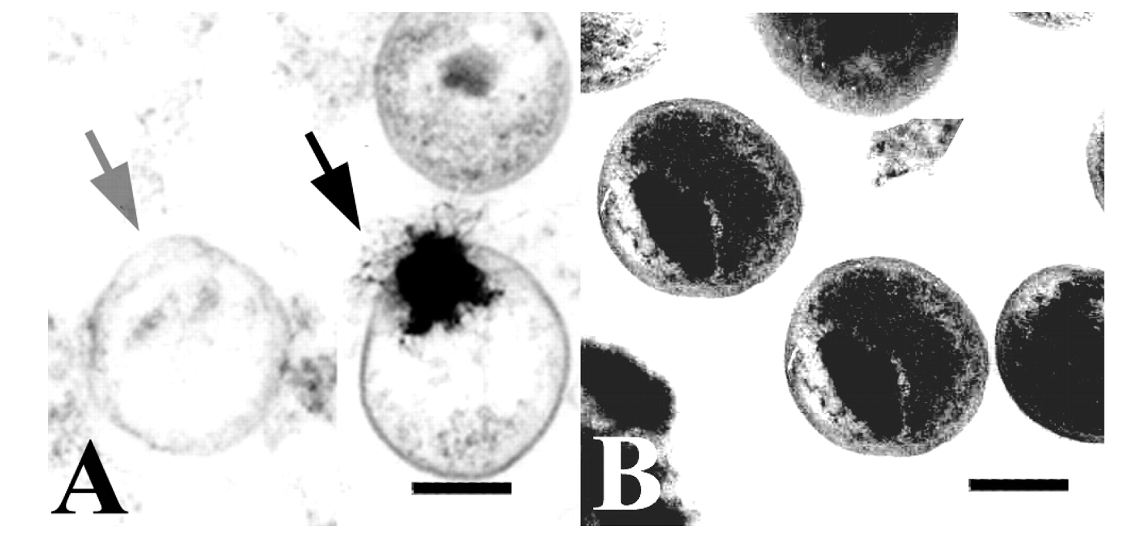 Electron micrographs of C. trachomatis exposed to cecropin peptide D2A21 for 90 min. (A) Organisms treated with D2A21 appear to be hollow or in the process of leaking their cytoplasmic contents (black arrow). (B) Untreated organisms incubated in SPG only. Bar = 0.5 μm. Adapted with permission from [12]. Copyright 2002 American Society for Microbiology.