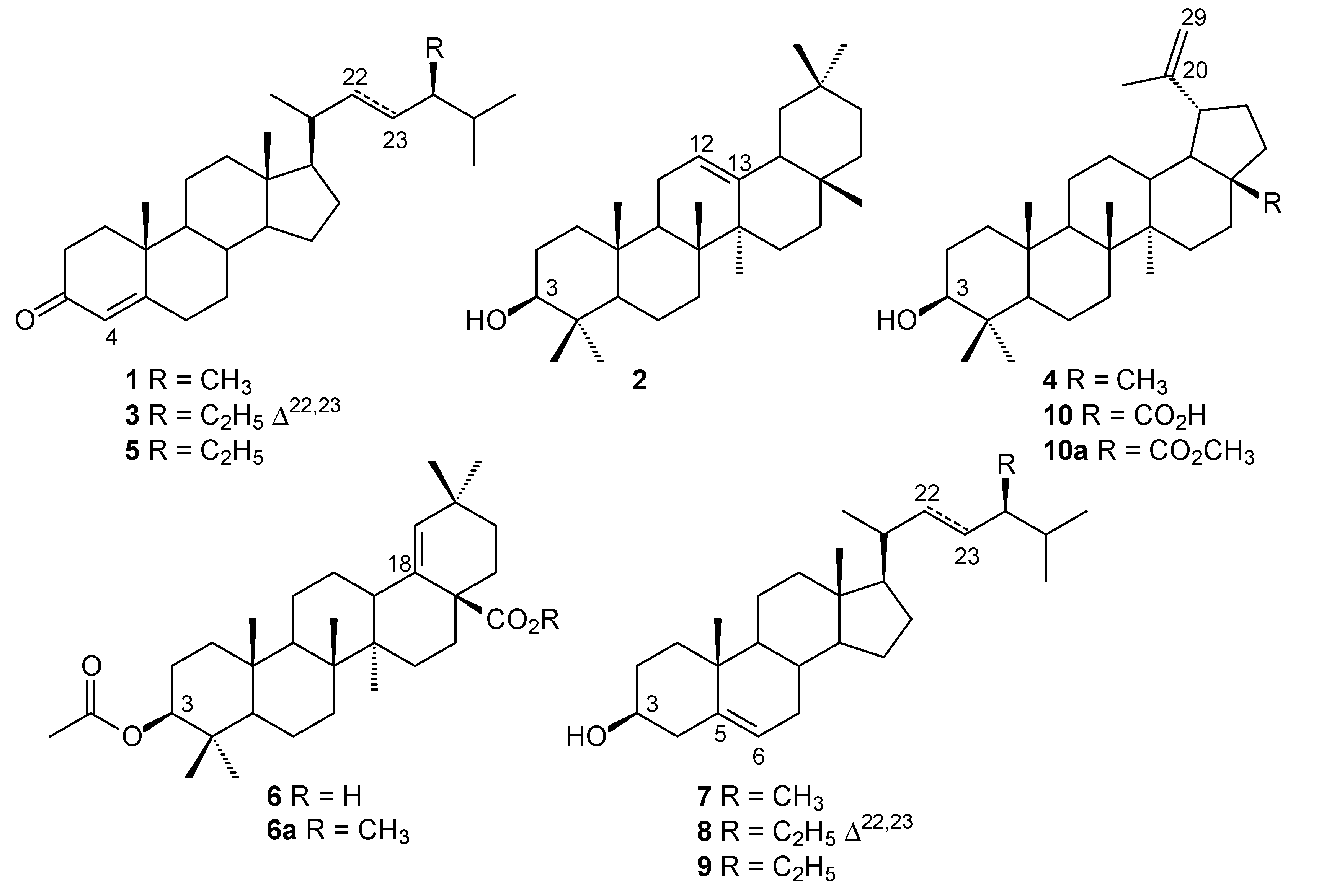 - Wright, J.L.C.; McInnes, A.G.; Shimizu, S.; Smith, D.G.; Walter, J.A.; Idler, D.; Khalil, W. Identification of C-24 alkyl epimers of marine sterols by 13C nuclear magnetic resonance spectroscopy. Can. J. Chem. 1978, 56, 1898–1093. [Google Scholar] [CrossRef]