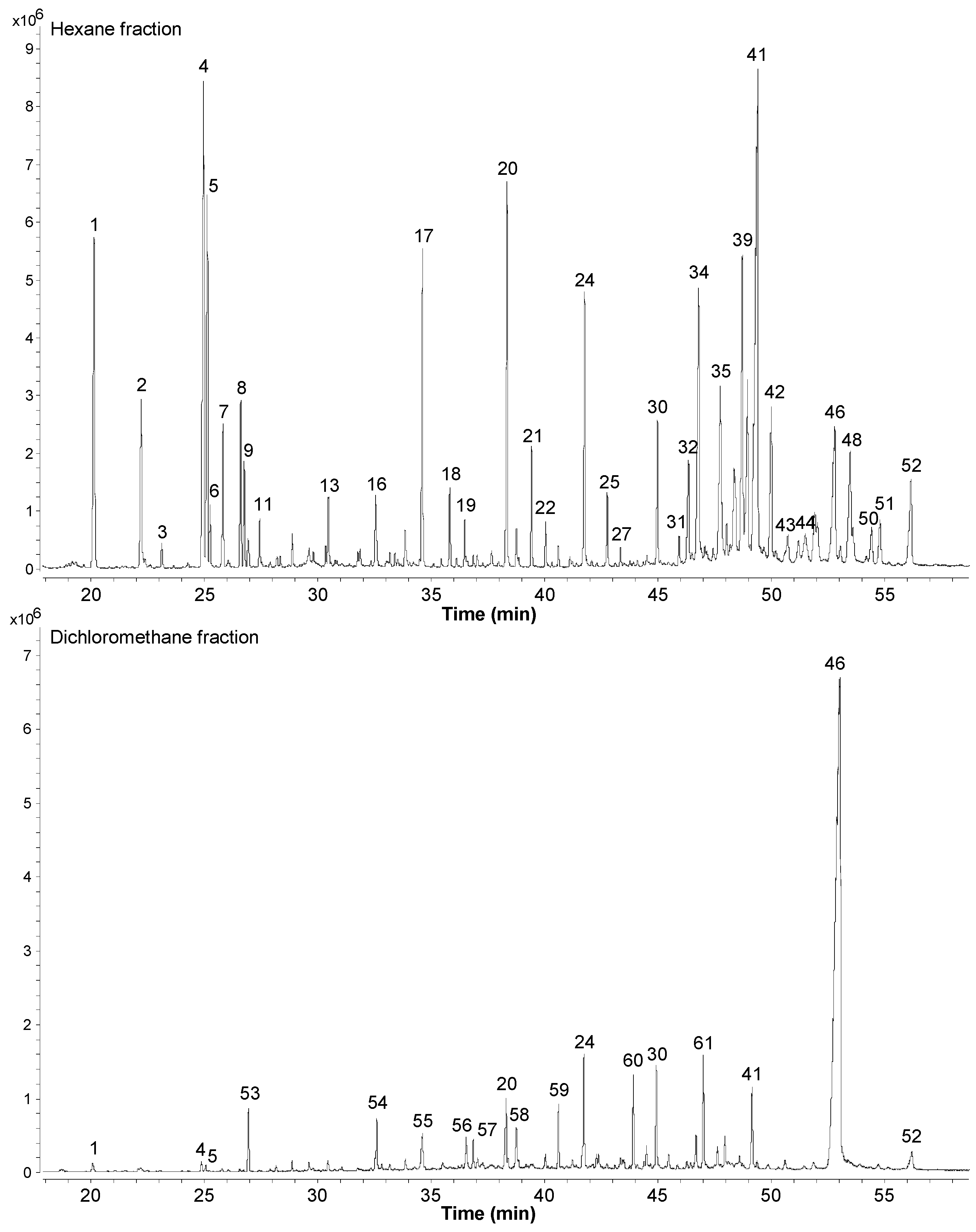 | Chemical Constituents | Molecular Formula | EIMS [M+•] | Rt (min) | HEX (%) | DCM (%) | ||