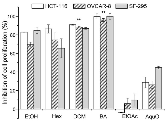 - Mahmound, T.S.; Marques, M.R.; Pessoa, C.Ó.; Lotufo, L.V.C.; Magalhães, H.I.F.; Moraes, M.O.; Lima, D.P.; Tininis, A.G.; Oliveira, J.E. In vitro cytotoxic activity of Brazilian middle west plant extracts. Rev. Bras. Farmacogn. 2011, 21, 456–464. [Google Scholar]
