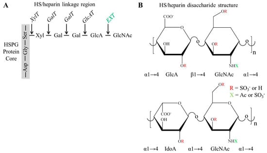 (A) Linkage region of GAGs illustrating the amino acid sequence within the PG protein core (serine (Ser), glycine (Gly) and aspartic acid (Asp)) required for covalent attachment of initial saccharide of the linkage region, xylose, where addition of GlcNAc via EXT is where GAG becomes a HS/heparin and diverges from CS synthesis route. (B) Comparison of disaccharide unit structures of HS and heparin and the functional groups present within tissues.