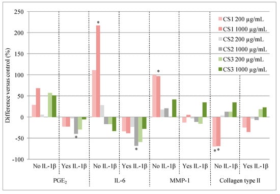 Tat et al. [16] examined the effects of two concentrations (200 and 1,000 µg/mL) of three chondroitin sulfate products (CS1, CS2 and CS3, detailed in Table 1) on human chondrocytes from the articular cartilage of patients with osteoarthritis undergoing total knee arthroplasty. Their effects on the following markers were examined: prostaglandin E2 (PGE2), an inflammatory mediator; IL-6, a pro-inflammatory cytokine; MMP-1, which leads to collagen breakdown; and collagen type II, which is a major component of cartilage. As illustrated in Figure 2, only CS1 (porcine) at 1000 µg/mL elicited significant effects in the absence of IL-1β, but these were detrimental: it increased IL-6 and MMP-1 production and decreased collagen type II expression (Figure 2).